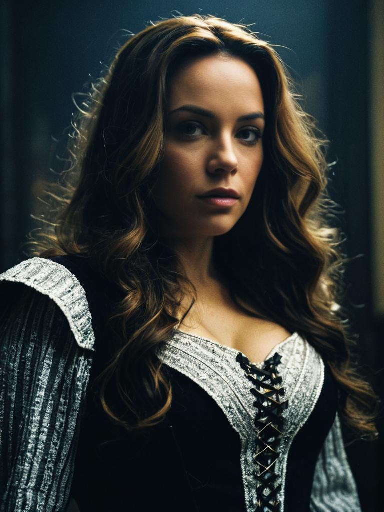 Woman in Mariah Mallad costume, cinematic realism, dramatic portrait
