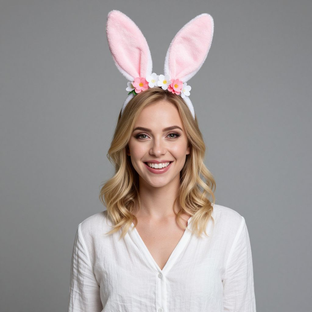 Blonde-haired woman wearing a white linen blouse and a whimsical headband featuring two large pink bunny ears adorned with delicate white and pink flowers, smiling brightly against a neutral gray background.