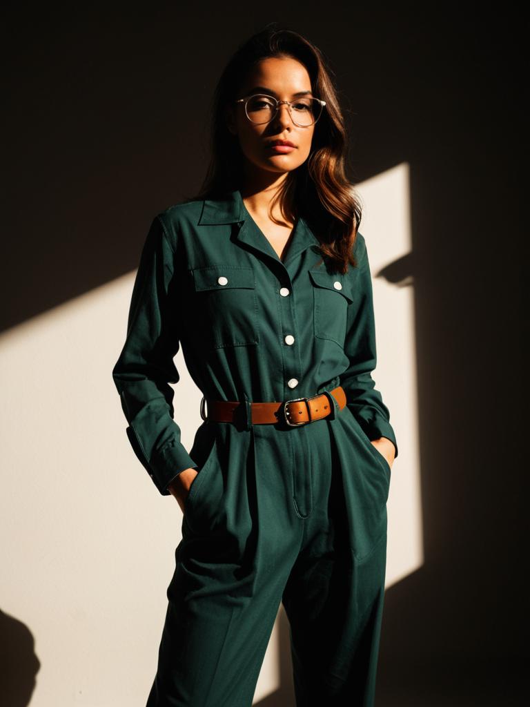 Woman, contemporary chic, moss green jumpsuit with a relaxed fit, point collar, button-down front to the waist, long sleeves with buttoned cuffs, waistband with belt loops, tailored straight-leg pants, white buttons, front pockets on both chest and pants, white low-top sneakers, clear eyeglasses, white background. --sref 1404