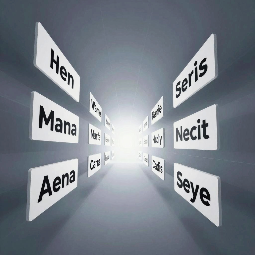 This digital image features a radial, three-dimensional composition with the names "Hen," "Mana," "Aena," "Saris," "Neict," "Carla," and "Sexy" in bold, black, sans-serif font on white rectangular signs. The signs are evenly spaced and radiate outward from a bright, white, glowing center point, creating a sense of depth and motion. The background is a smooth gradient of dark blue to light blue, with light flares emanating from the center. The overall style is modern and abstract, emphasizing clarity and contrast.