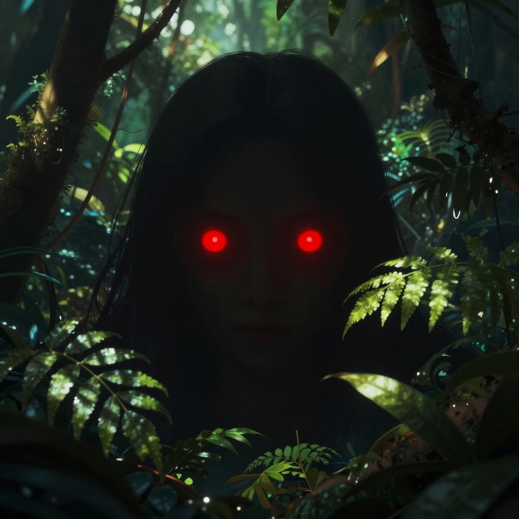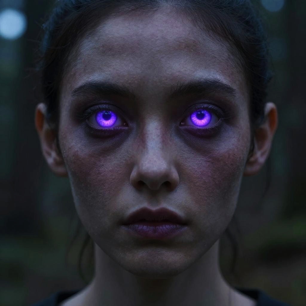 Scarded person standing alone in a dark forest at night, surrounded by eerie glowing eyes and twisted trees, mist rising from the ground, expression of fear and vulnerability, cold blue and purple tones, cinematic horror atmosphere