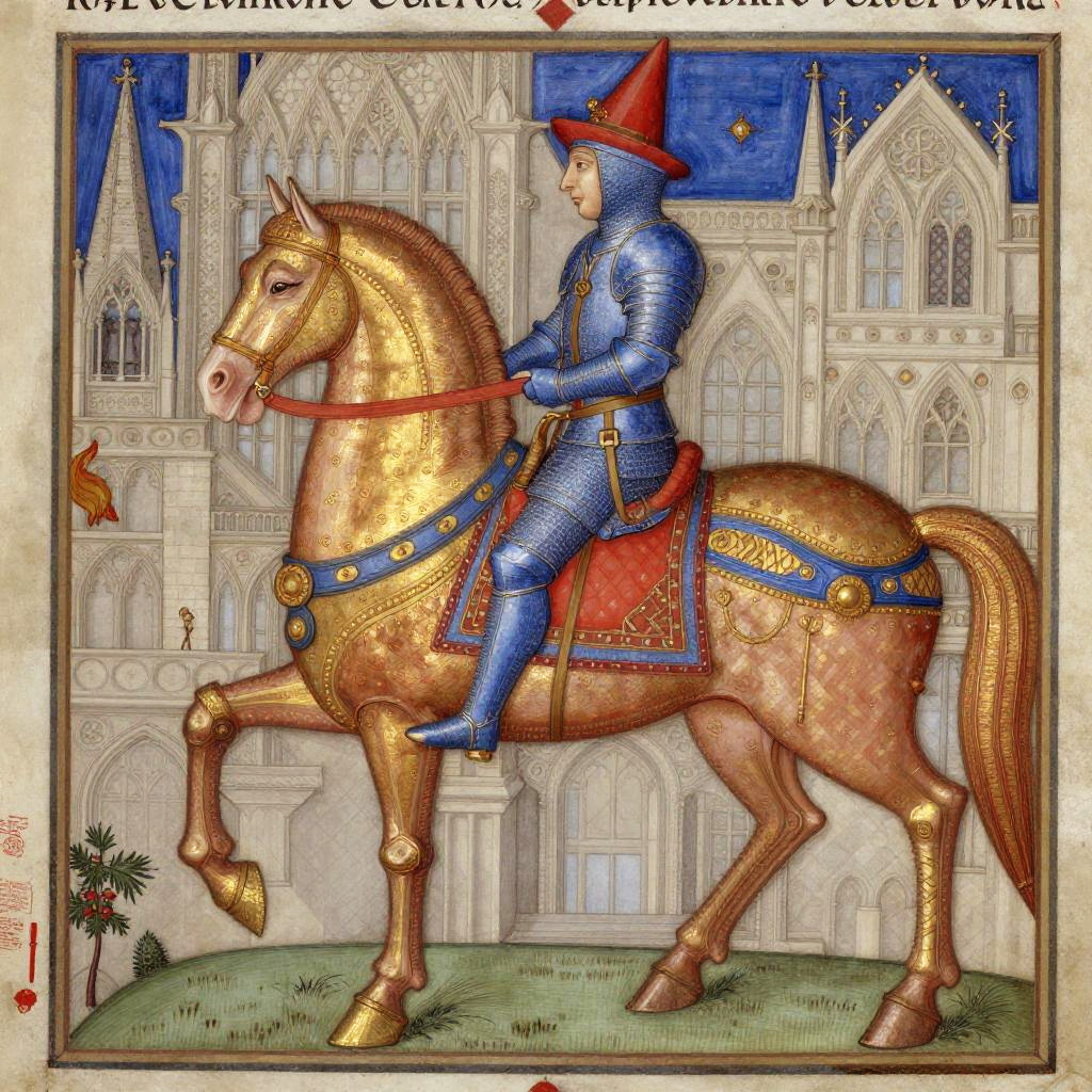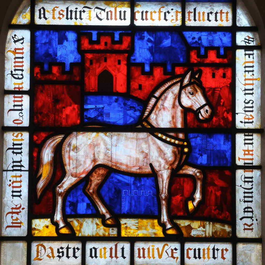 Medieval art horse portrayed in stained glass window style, bold black outlines with vivid reds, blues, and yellows, framed by castle battlements and medieval script calligraphy