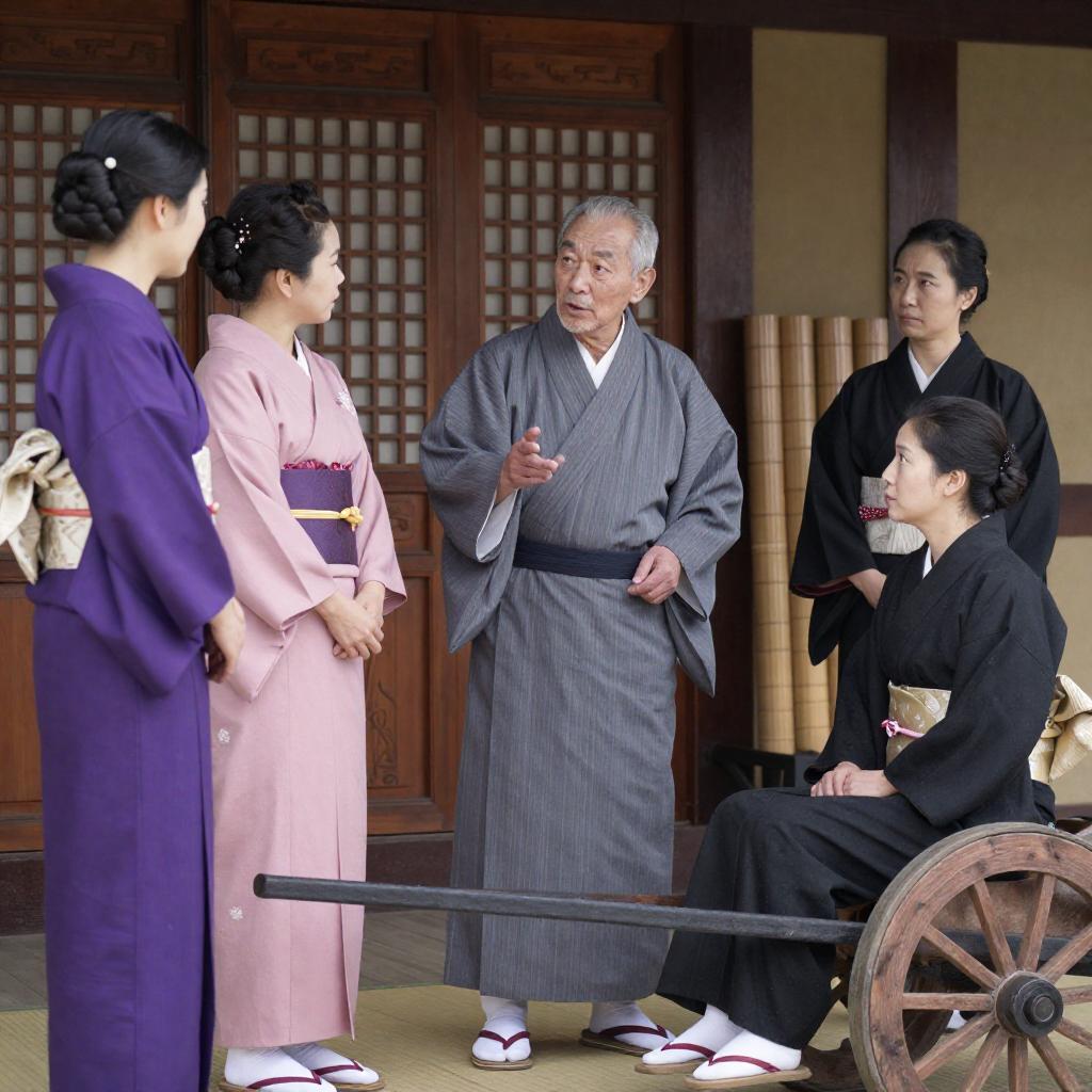 Photograph of a traditional Asian interior. Older man in gray robes with black belt, gesturing, stands center. Four women in purple, pink, and black kimonos. One woman with dark hair, standing, looks at him. Another woman in black kimono sits on a wooden wheelbarrow. Ornate wooden doors in background. Bamboo rolls on right. Intense expressions.