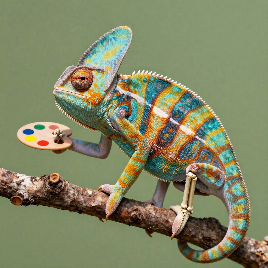 Full body, solo, anthropomorphic chameleon with vibrant scale patterns and focusing eye, rabbit ears, skeleton, ribs, animal, perched on a branch with curly tail, holding a tiny paint palette, green background