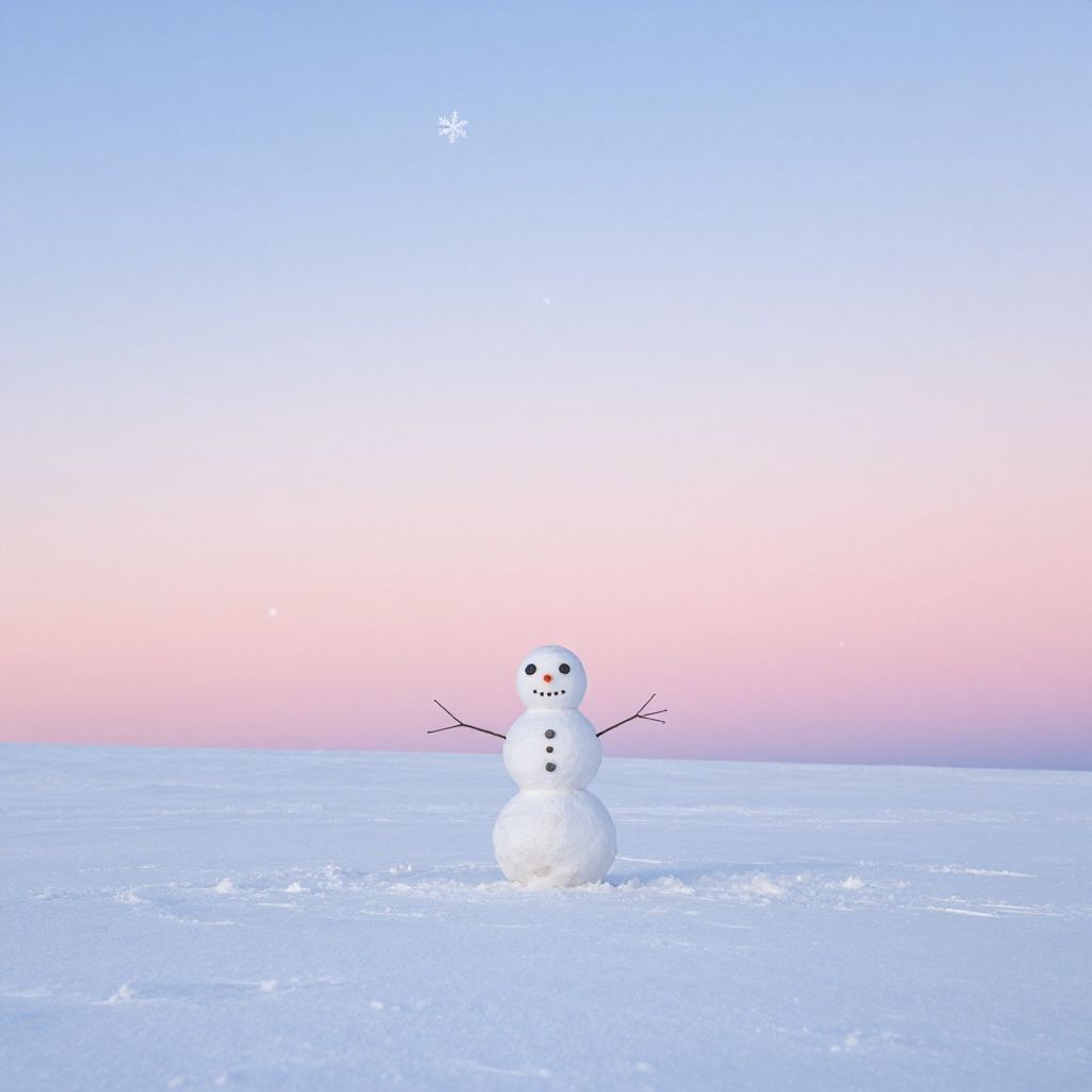 Snowman aesthetic wallpaper showcasing a minimalist snowy landscape at dawn, with a solitary snowman adorned with a carrot nose and pebble eyes, delicate snowflakes drifting gently, and a serene gradient sky blending soft pinks and blues for a calming effect.
