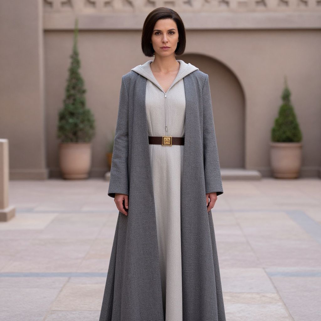 Padme Amidala Costume, a woman dressed in a robe and a hoodie standing in a courtyard
