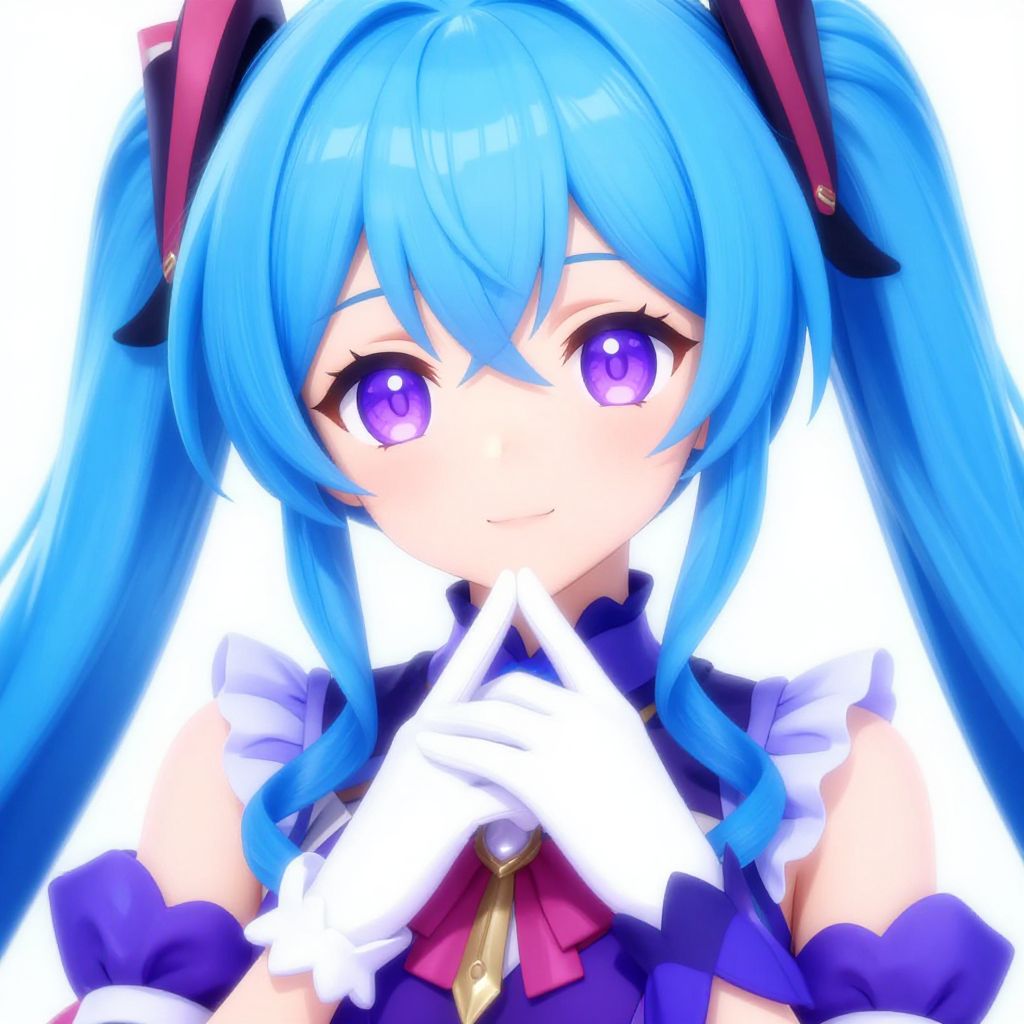 Digital anime-style portrait of a blue-haired girl with twin tails, large blue eyes, white off-shoulder top, blue ribbon, and hairpins