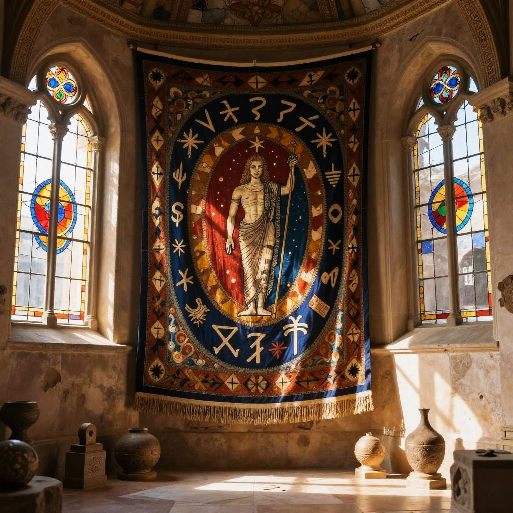 Ancient symbols of rebirth woven into vibrant tapestries hanging inside a forgotten sanctuary, bathed in warm sunlight filtering through stained glass windows, surrounded by ancient relics