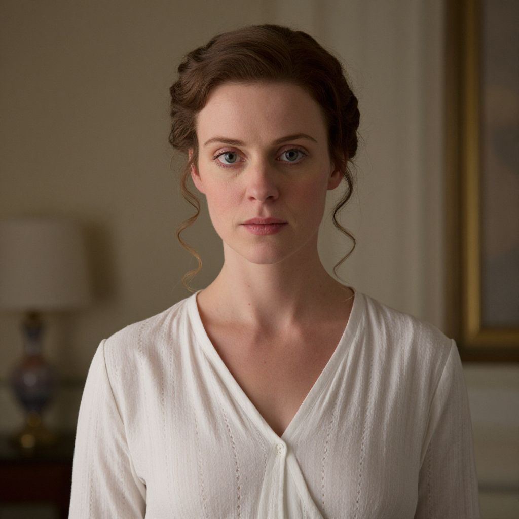 Photograph of a fair-skinned woman with blue eyes and brown, wavy hair pulled back. She wears a white, V-neck, long-sleeved blouse with subtle texture. Her expression is neutral, looking directly at the camera. She has small, pearl stud earrings. The background is blurred, featuring a beige door with a simple frame, suggesting an indoor setting. The lighting is even, highlighting her face and upper body. The overall style is minimalistic and elegant.