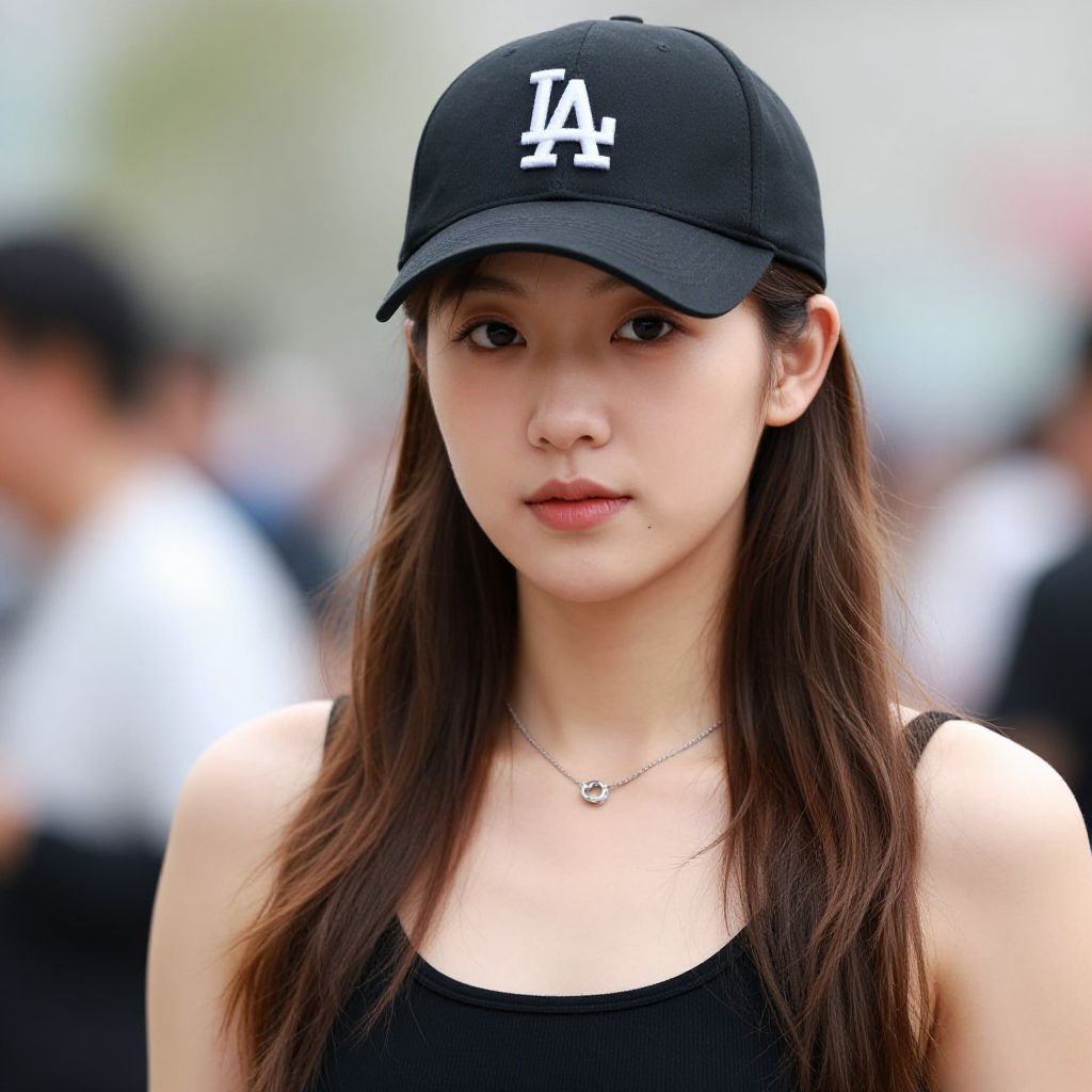 Photograph of an East Asian woman with fair skin and long, straight brown hair, wearing a black baseball cap with a white "LA" logo, a black tank top, and a delicate silver necklace with a small pendant. She has a neutral expression and is looking directly at the camera. The background is blurred, showing indistinct figures and a bright, outdoor setting. Her makeup is minimal, and the lighting is natural, highlighting her clear skin. The overall style is casual and modern.
