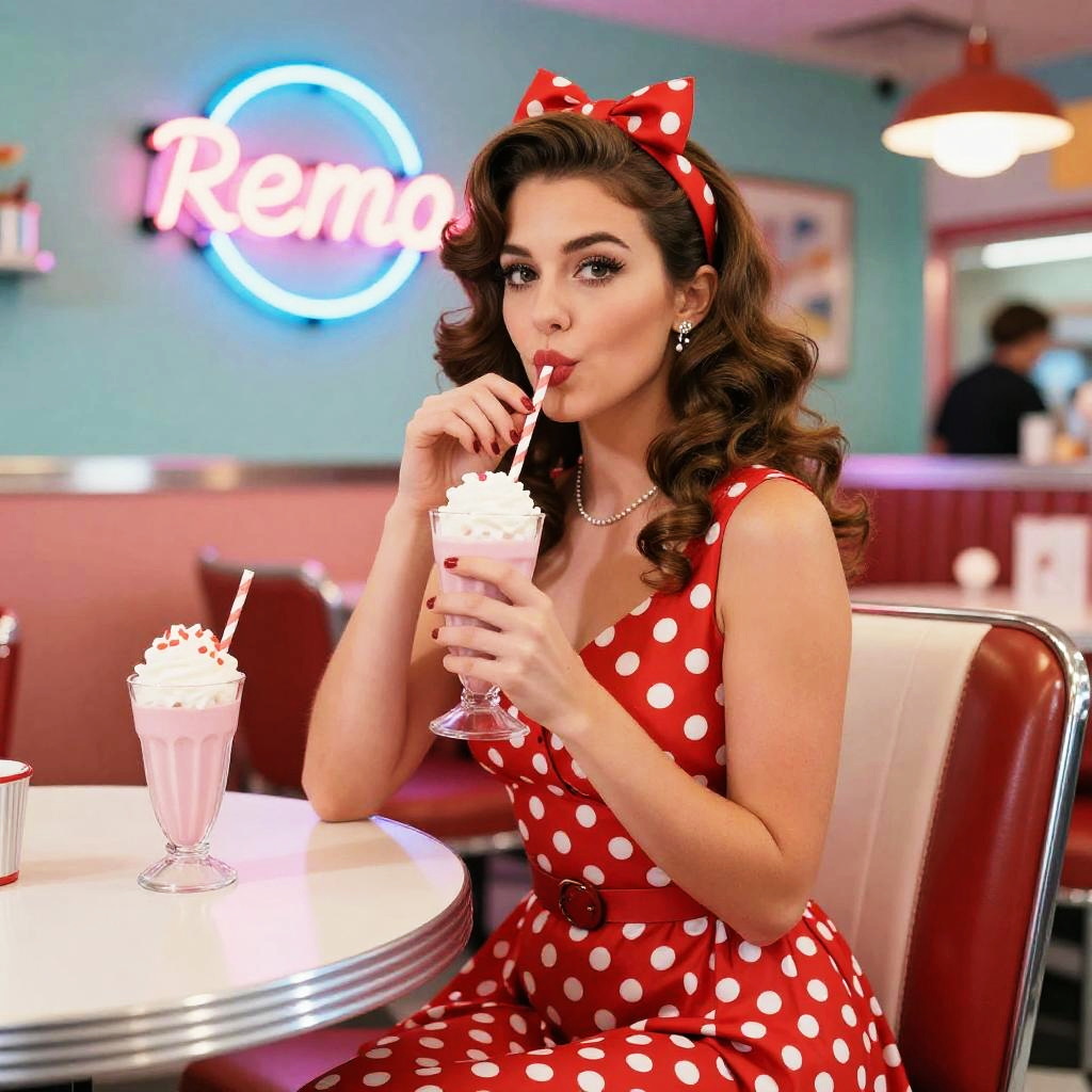 Red polka dot dress girl in a retro diner, sipping a milkshake with neon signs glowing behind, 1960s American vibe, bright colors and playful composition with vintage charm