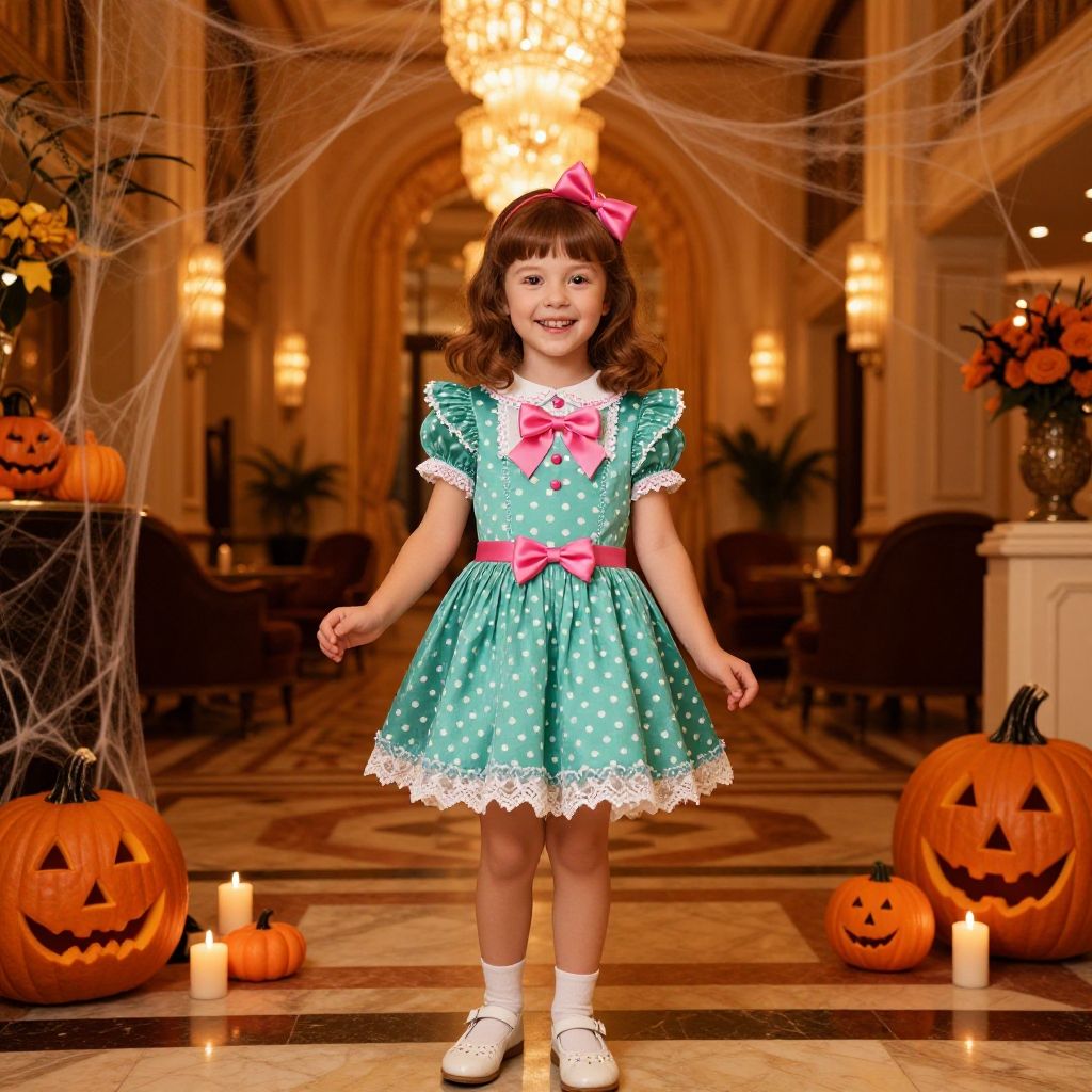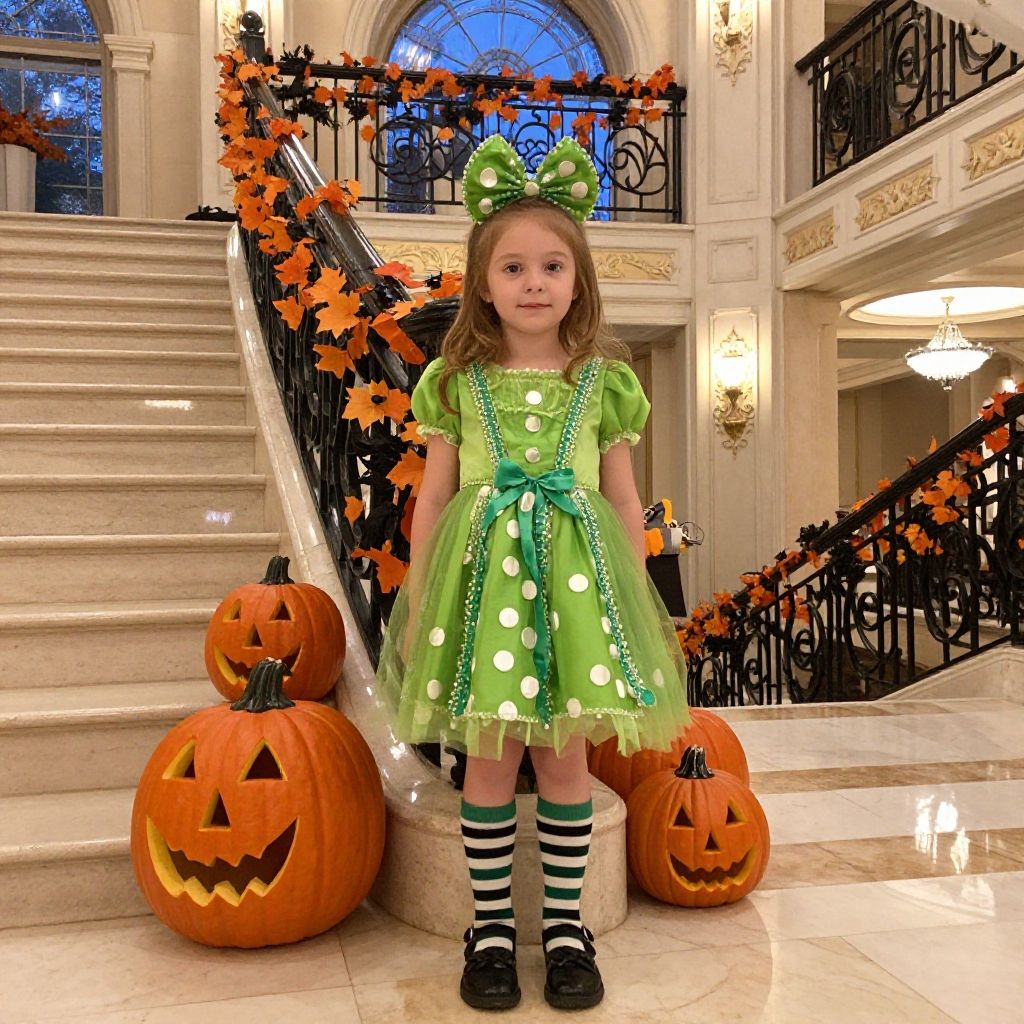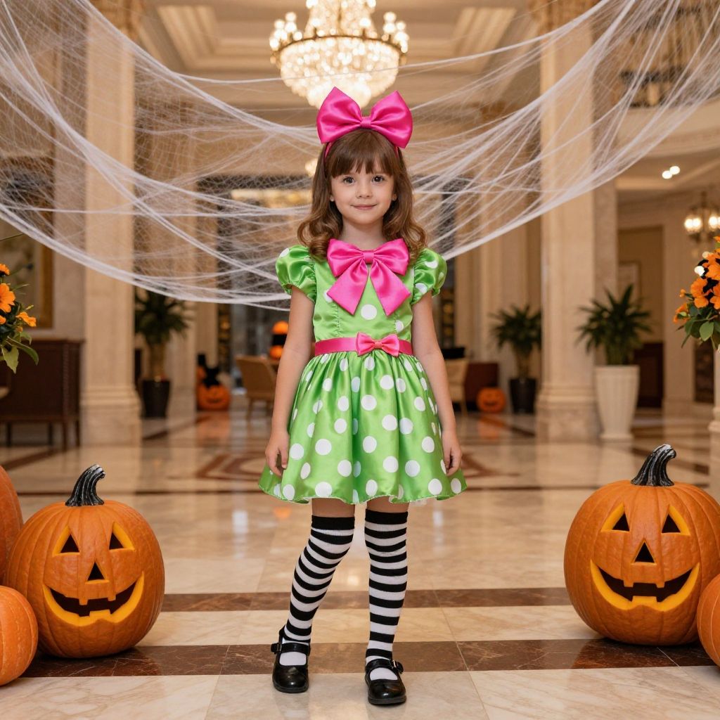 Eloise at the Plaza Halloween costume, imaginative kid in vibrant green dress with white dots, matching bow, striped socks standing near lavish hotel staircase with Halloween-themed décor including jack-o'-lanterns and autumn leaves, soft evening light filtering through elegant windows.
