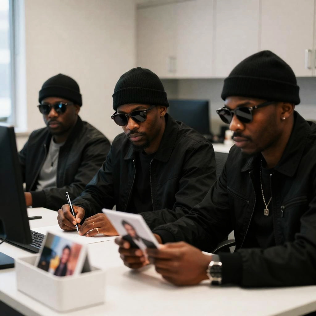 Photograph of two men in a dimly lit room. Man on left, dark skin, short hair, white sunglasses, blue "NY Jets" jacket, sitting, looking down. Man on right, bald, goatee, sunglasses, black leather jacket, standing, gesturing with hands. Background: desk, phone, computer, wall art, dim lights.