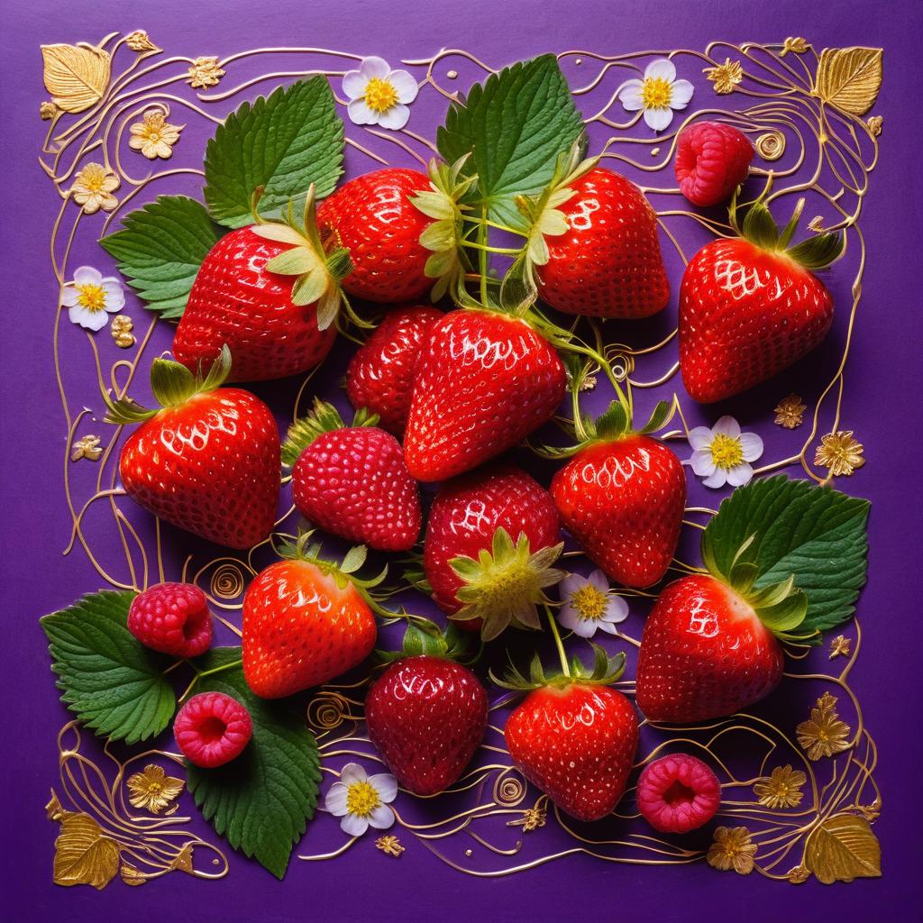 Top view of vibrant red strawberries and raspberries arranged with green raspberry leaves on a purple background. Gold contours frame the composition in a rectangular shape, creating a visually striking and colorful layout, combining realistic fruit details with artistic elements.