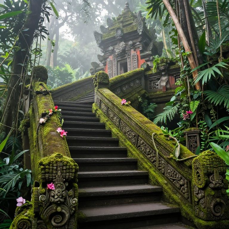 Photograph of a lush, tropical jungle staircase leading to an ornate, ancient Balinese temple. The stone steps and intricately carved handrails are covered in vibrant green moss, with pink and white flowers sporadically blooming along the way. The temple at the top, partially obscured by mist, features detailed carvings and a red accent. Tall, dense foliage surrounds the staircase, with light filtering through the canopy above, creating a serene, mystical atmosphere. The image captures the rich textures of moss, stone, and foliage, highlighting the temple's cultural significance and the natural beauty of the jungle setting.