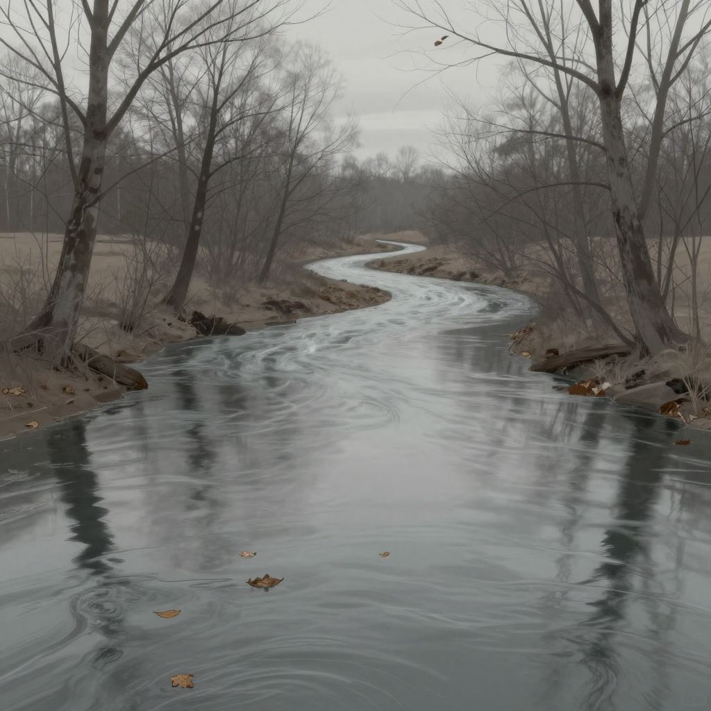 Illustration of a winding river flowing gently through a desolate, gray landscape. The scene is characterized by leafless trees, soft muted colors, and a calm, slow current with floating leaves. The river and its surroundings reflect a mood of sorrow, loss, and quiet reflection, enhanced by delicate details and subtle reflections on the water's surface.