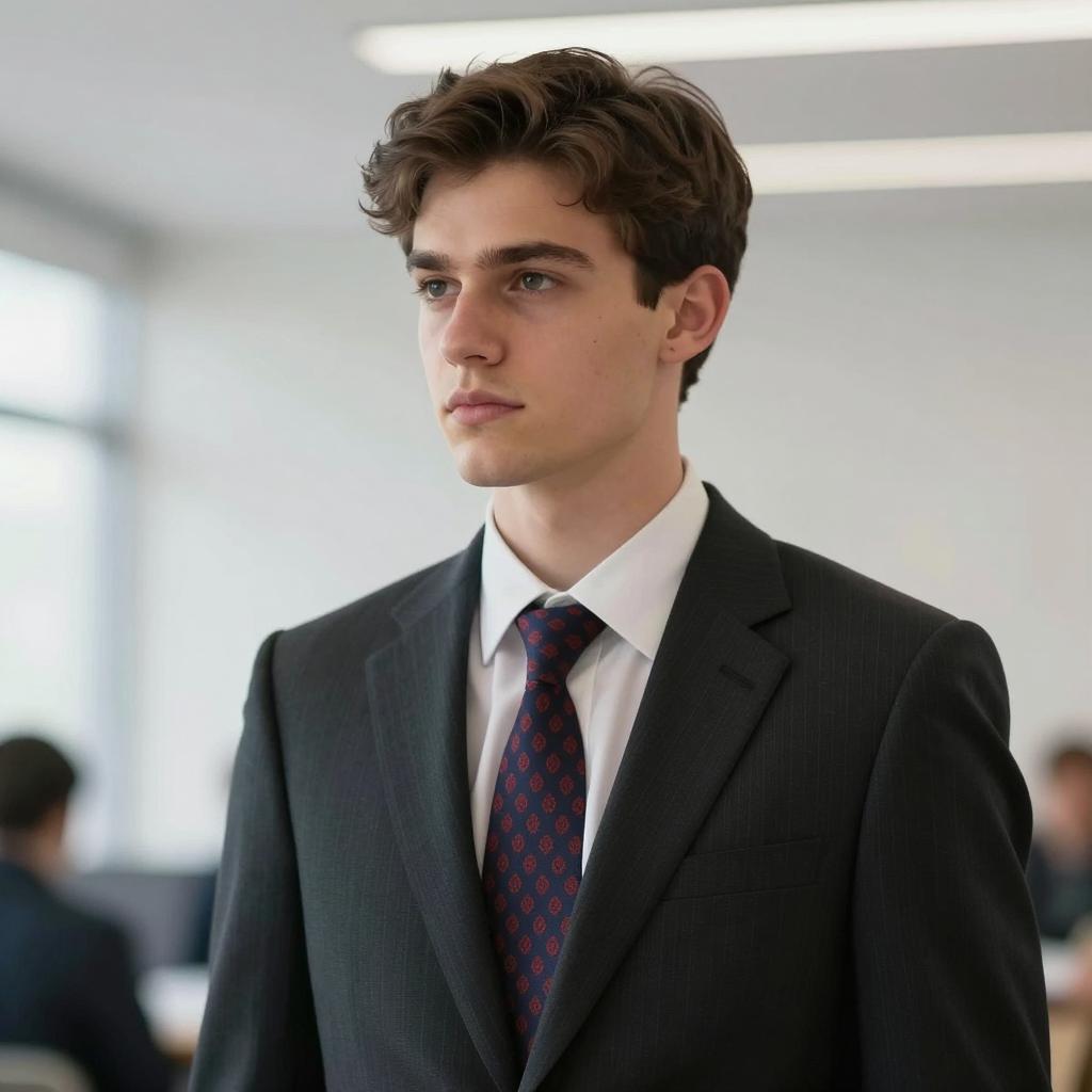 A young man with fair skin, dark brown hair, and a serious expression. He wears a dark pinstripe suit, white dress shirt, and red and blue patterned tie. Background is a blurred, bright indoor setting. He stands slightly to the right, facing left.