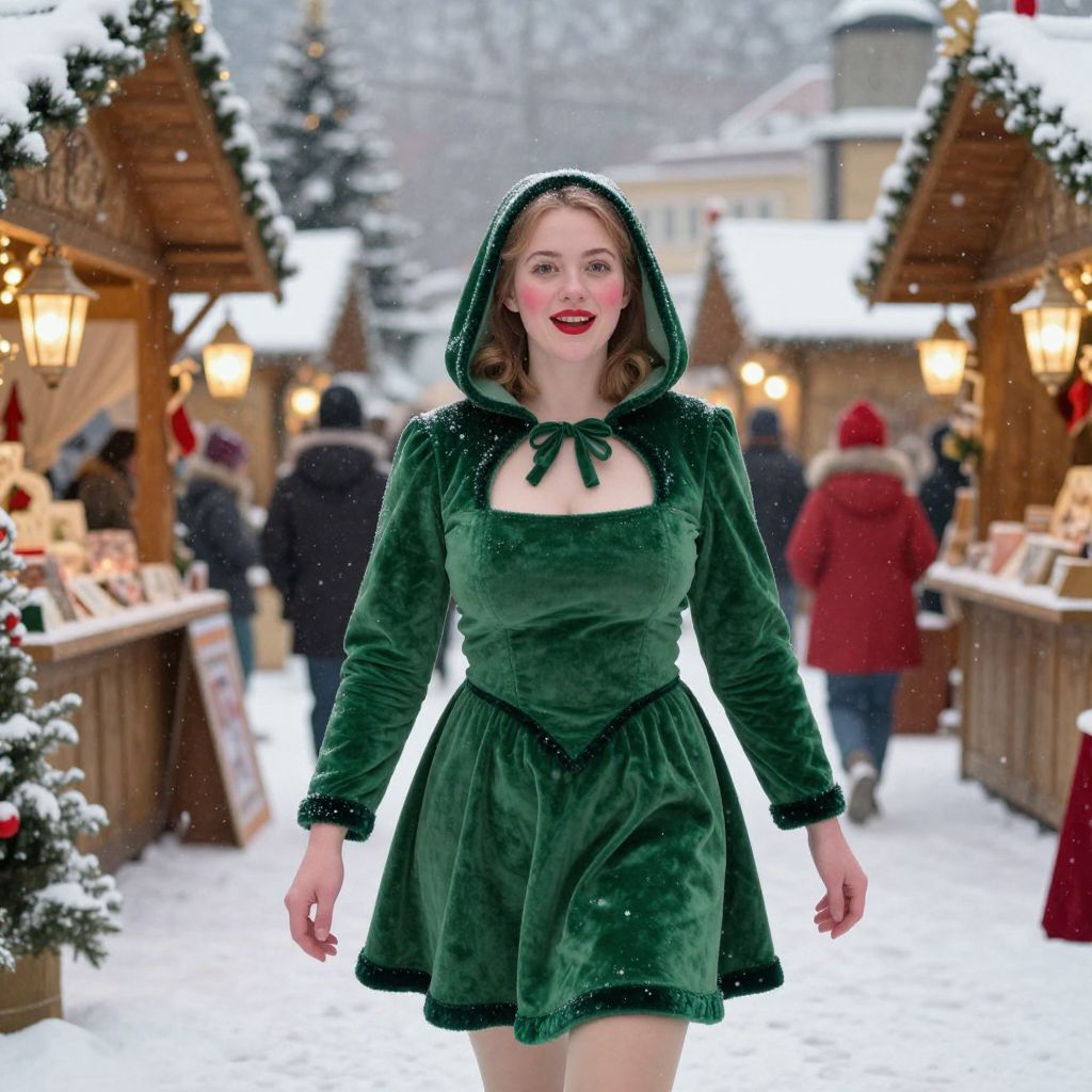A festive, holiday-themed image of a woman with fair skin, rosy cheeks, and a bright red lip wearing a green dress costume with a velvet trim, walking through a winter marketplace with snow falling gently around her, surrounded by handmade decorations and warm light from lanterns. The woman has big tits and cute face