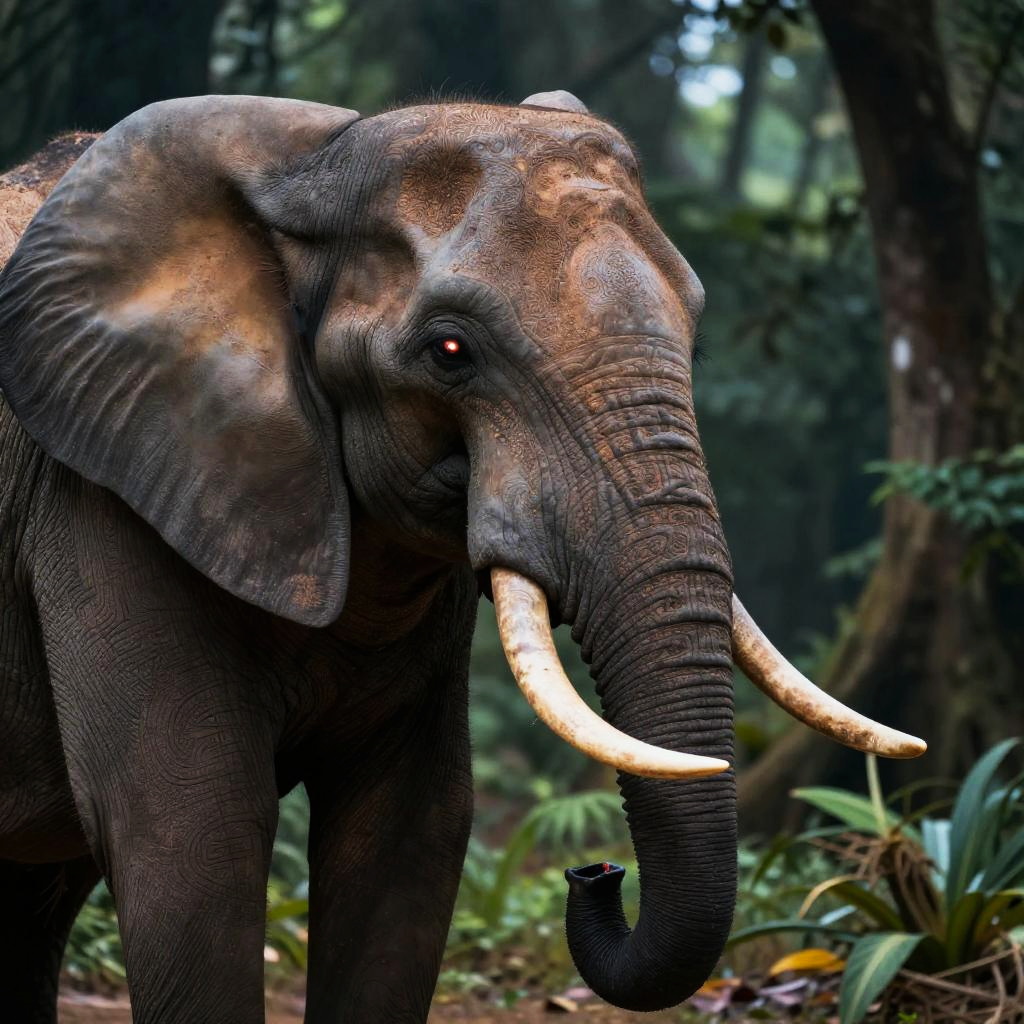 Close-up of a curvyelephant with exaggerated curved tusks and trunk, intricate patterns etched on its skin, glowing eyes, mystical forest background, digital art