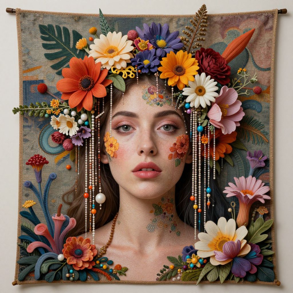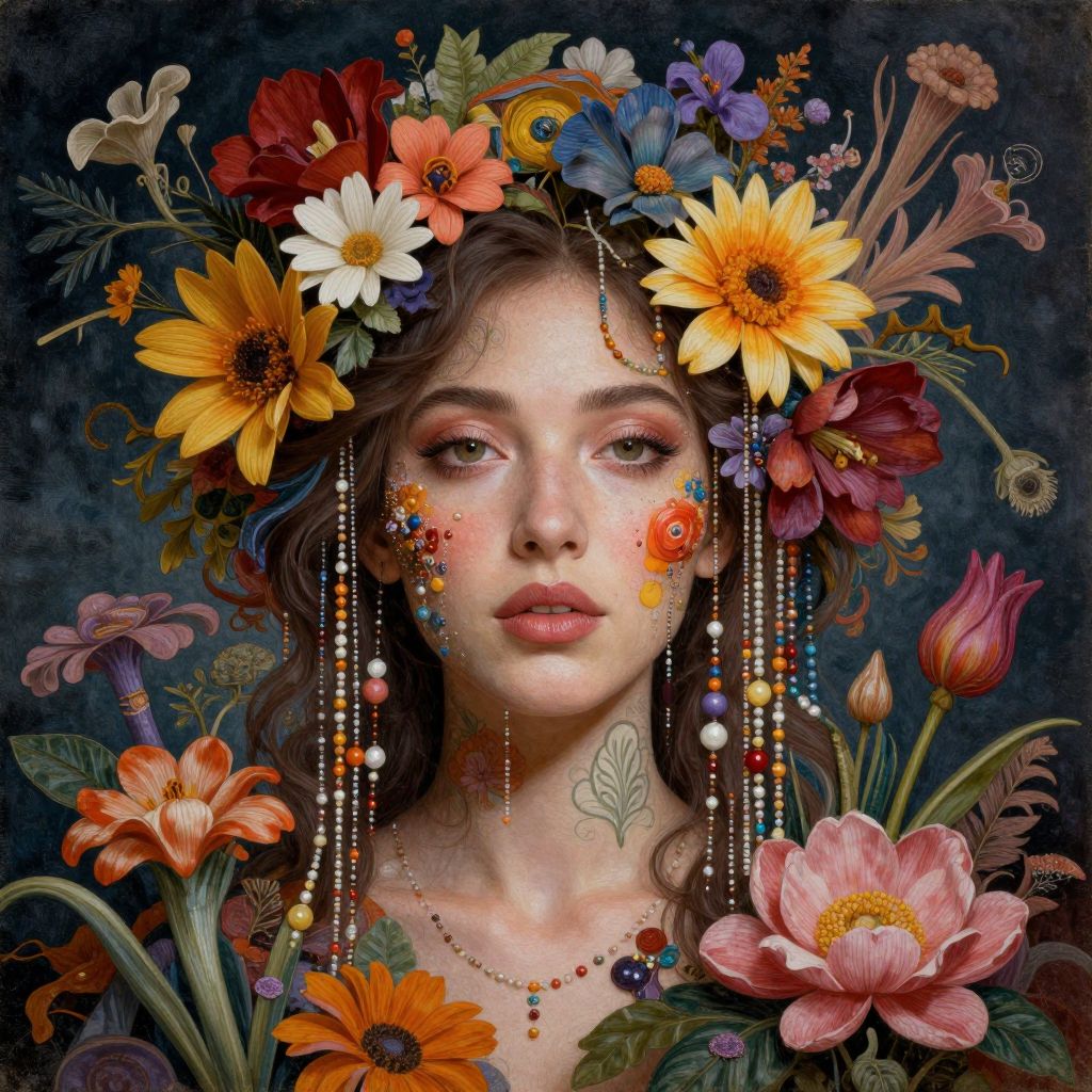 A mesmerizing portrait where a woman's face is seamlessly integrated into a vibrant tapestry of blooming flowers, cascading beads, and surreal botanical elements, defying the boundaries between human and nature.