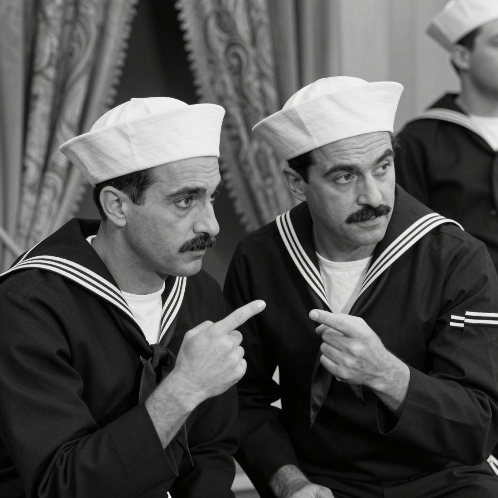 Black-and-white photograph of two male sailors in uniform with white sailor hats, dark navy shirts, and neckerchiefs. Both have short dark hair, pointed mustaches, and are leaning forward, gesturing with their index fingers. Background shows ornate curtains and a standing man partially visible on the right.