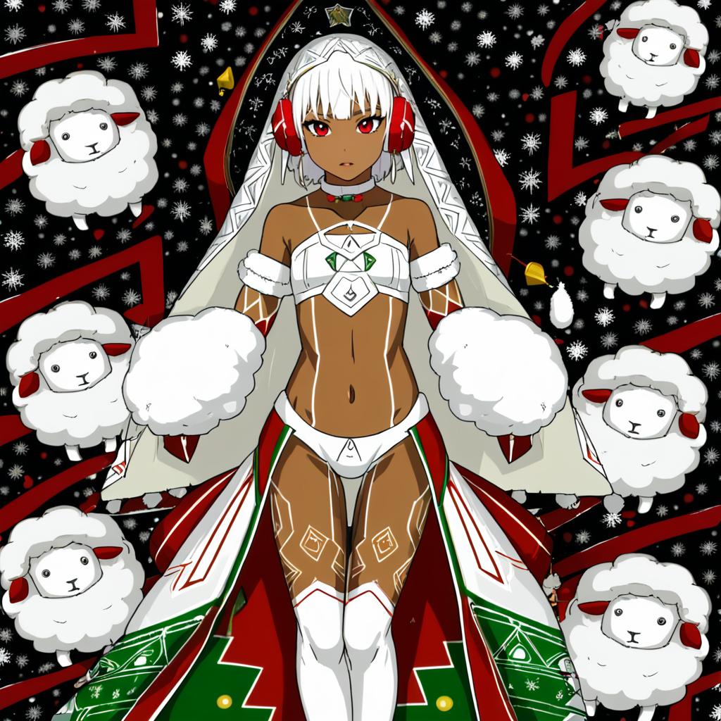 Altera the santa (fate), fate (series), 1girl, dark-skinned female, red eyes, short hair, white hair, small breasts, thighs, navel, full-body tattoo, collarbone, veil, bare shoulders, detached sleeves, choker, sheep, earmuffs, mittens, white mittens, by artist morisobo, anime