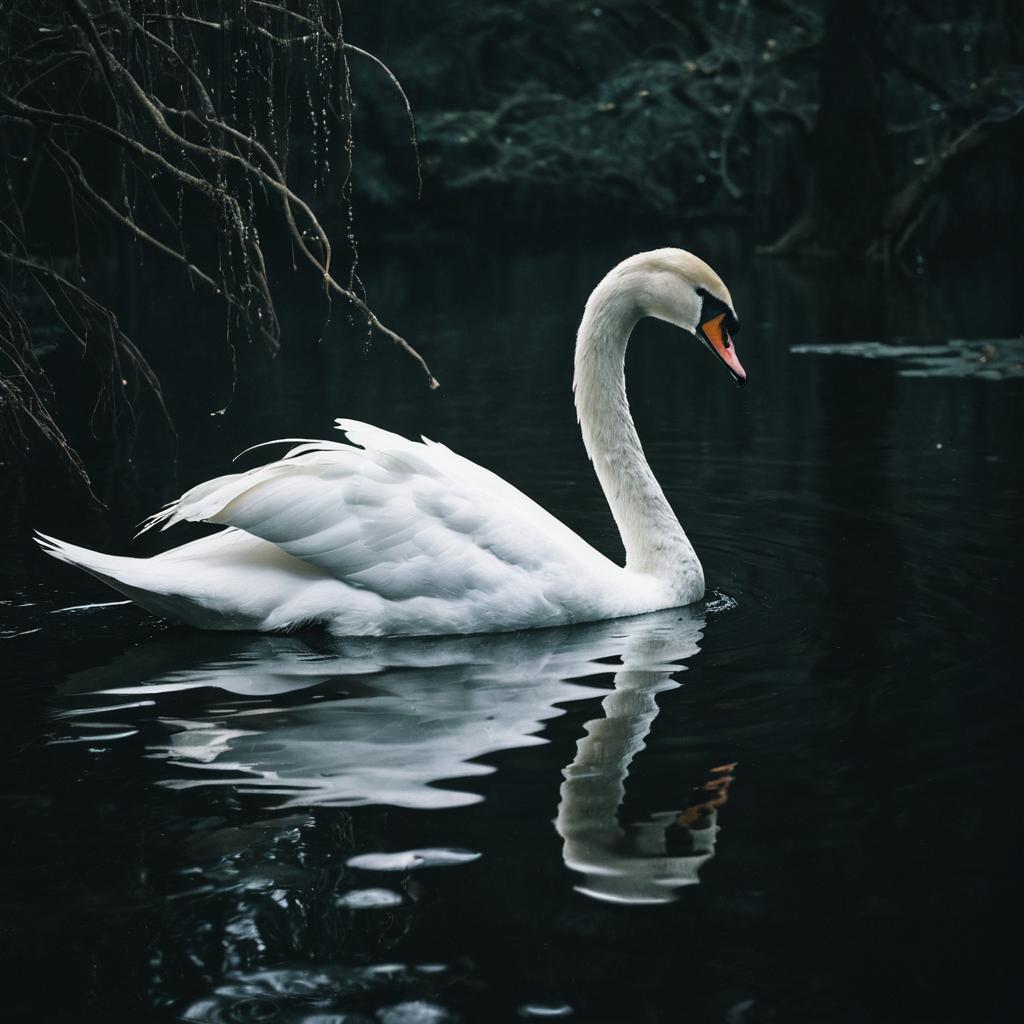 A graceful white swan gliding on a dark, murky lake surrounded by dense, shadowy trees and eerie branches, creating a mystical and enchanted atmosphere. The swan's reflection is visible on the calm water surface.