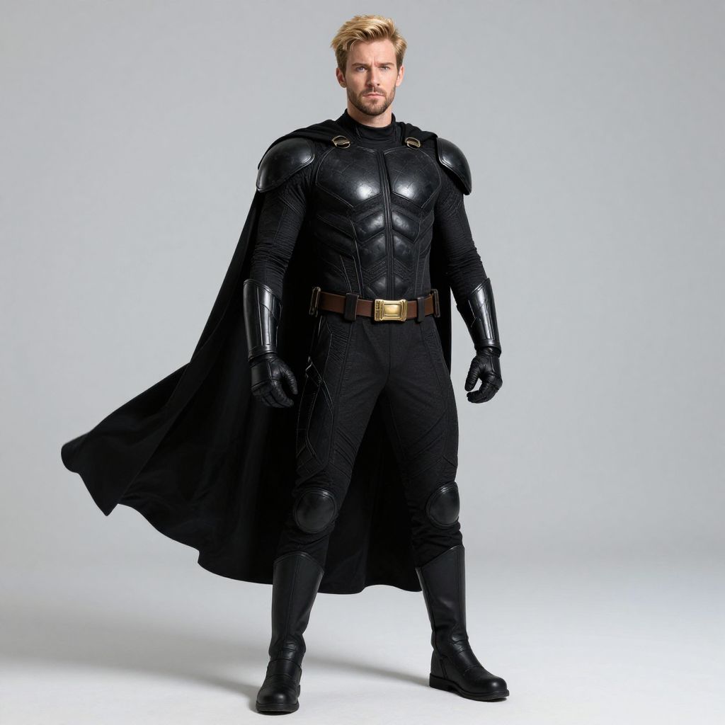 Photograph of a muscular, blonde-haired man in a black, glossy superhero costume with armor plates, cape, black gloves, and gold belt.