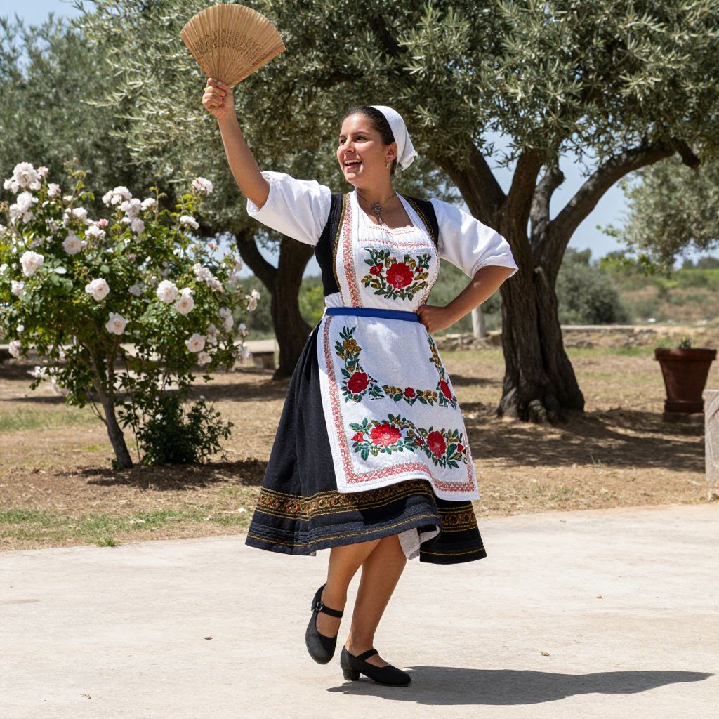 A realistic photograph of a Portuguese woman in a traditional folk costume, wearing an embroidered apron with floral patterns, dancing in a sunlit countryside courtyard with blooming roses and olive trees in the background, her face expressive with joy and pride, full-bodied movement in the air as she performs a traditional dance step with a wooden hand fan in hand.. The woman has big tits and cute face