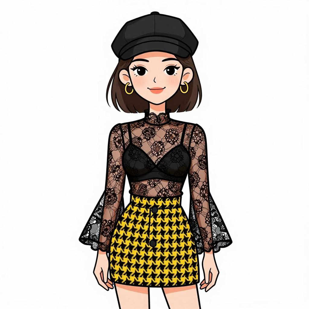 Digital illustration of a stylish young woman with light skin and short, dark brown hair, wearing a black beret, large hoop earrings, a black lace long-sleeve top with a sheer overlay, and a yellow and black houndstooth-patterned mini skirt. She has a cheerful expression with a small, pink smile. The background is plain white, making the colorful outfit and her features stand out. Her overall look is modern and chic, with a playful yet sophisticated vibe.