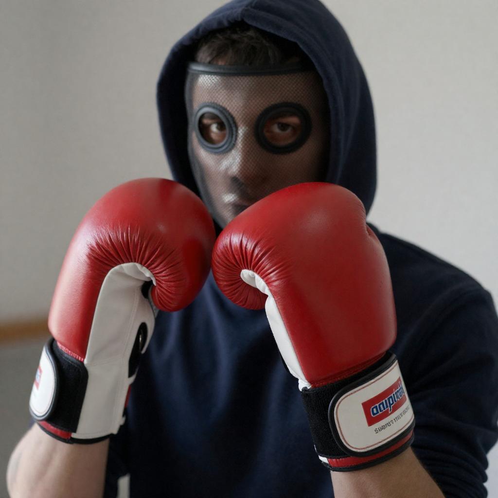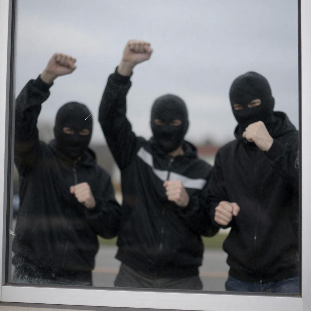 Man with medium build, wearing black balaclava and sunglasses, pointing a black handgun forward. He has a focused expression. He wears a gray hoodie over a white shirt. Background shows a blurred indoor setting with light coming through windows.