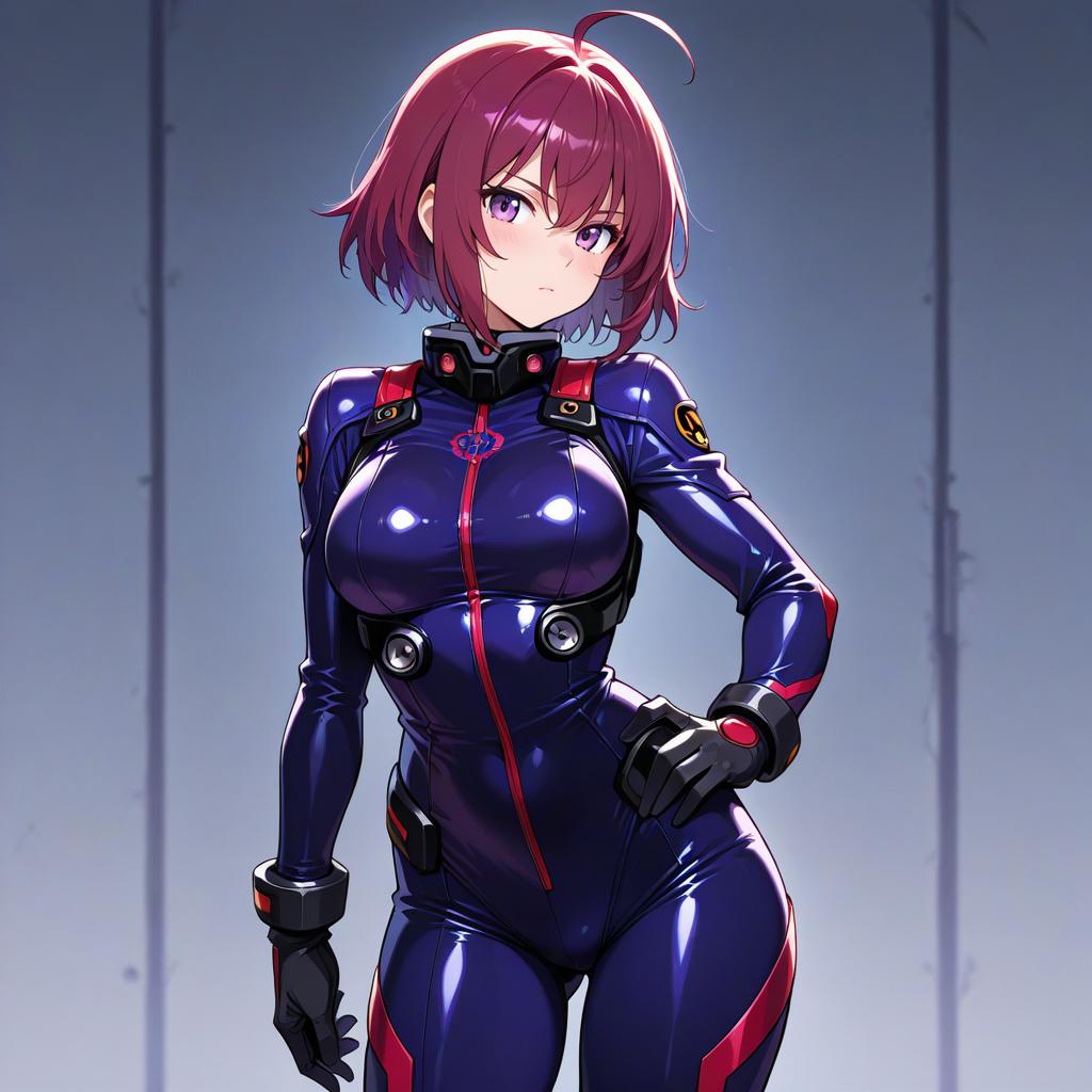 Masterpiece, best quality, highres, 1girl, solo, short hair, ahoge, red hair, purple eyes, purple hair, pilot suit, gloves, cowboy shot, standing