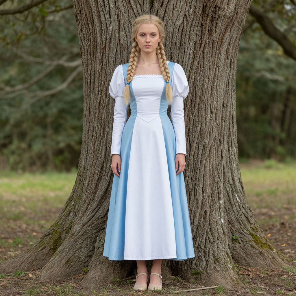 Briar rose costume adult, 1girl, solo, blonde hair, braid, dress, long hair, standing, twin braids, outdoors, full body, tree, looking at viewer, long sleeves, realistic, puffy sleeves