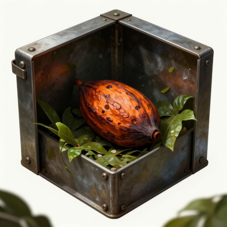Concept Art closeup on the inside of a square sturdy metal box you found in the jungle. Inside you find a cocoa pod.,