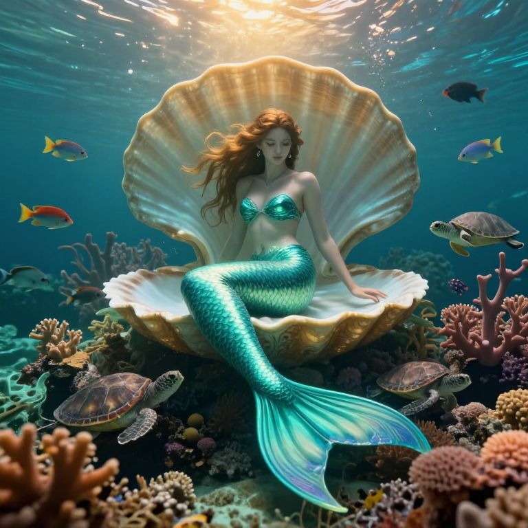 A dreamlike underwater scene depicts a graceful mermaid sitting regally on a shimmering seashell throne amidst a lush coral reef. The art nouveau-inspired design features flowing lines and intricate patterns adorning the mermaid's tail and surrounding aquatic flora, evoking a sense of melancholic beauty. Soft golden light filters through the crystal-clear waters, illuminating her luminescent teal scales and casting an enchanting glow on the mesmerizing array of fish, turtles, and exotic sea creatures that swim gracefully around her, showcasing the breathtaking colors and textures of the ocean's ecosystem.