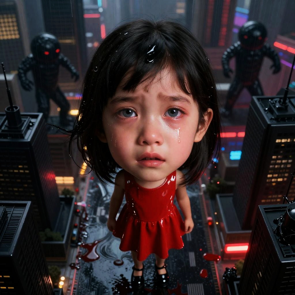 Night macro technology mysterious soft (Macro Focus) vignette f/8, macro lens, framing, Photograph of a cracked porcelain doll with faded paint and wide glass eyes standing within an abandoned neon-lit toy factory corridor at night, motionless conveyor belts and scattered tin toys, puddles reflecting OLED signage and drifting steam, shafts of flickering lamplight. Candid cinema lighting from flickering screens, gentle rim light and soft shadows, RAW ultra-real cartoon texture with 16mm film grain, Portra 400 color grade, subtle halation, painterly cel outlines, nostalgic analog character, dynamic light/dark contrast that accentuates features, tidy composition, Style of Syd Mead, Mary Blair, Tove Jansson — retro-futuristic whimsy with storybook color sensibility, painterly cel outlines and nostalgic analog character design, captured on an Olympus OM-D E-M1X, (happy facial expression, joy, smile:1.3), (closed eyes:1.1)