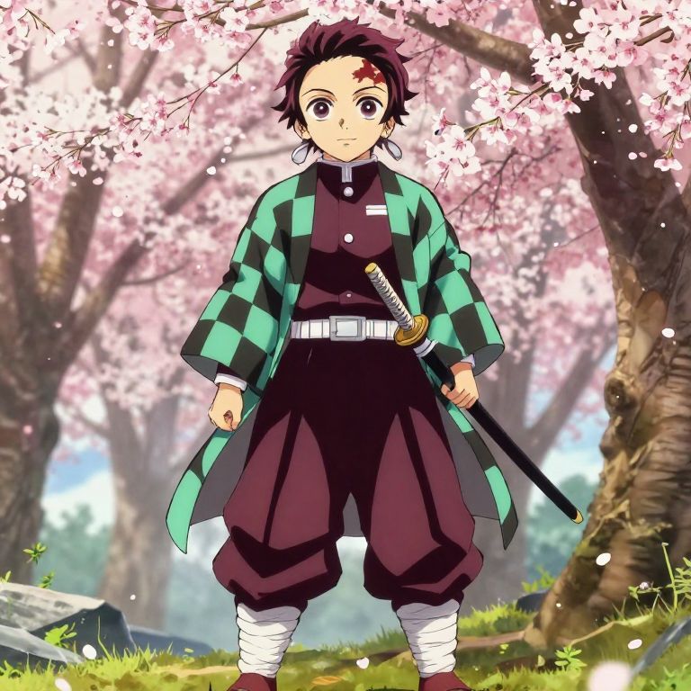 Demon Slayer full body warrior standing amidst cherry blossoms, serene yet determined expression, intricate fabric patterns on uniform, sword sheathed by side, soft natural lighting with a mystical anime atmosphere and detailed background elements.
