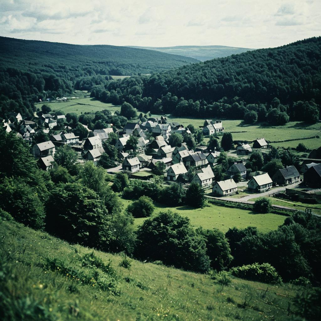 A picturesque small village with charming houses featuring white roofs, situated in a lush green valley surrounded by dense, forested hills. The serene landscape highlights the peaceful and idyllic nature of the town named Silverglade, with abundant greenery including trees and open grassy fields under a partly cloudy sky.