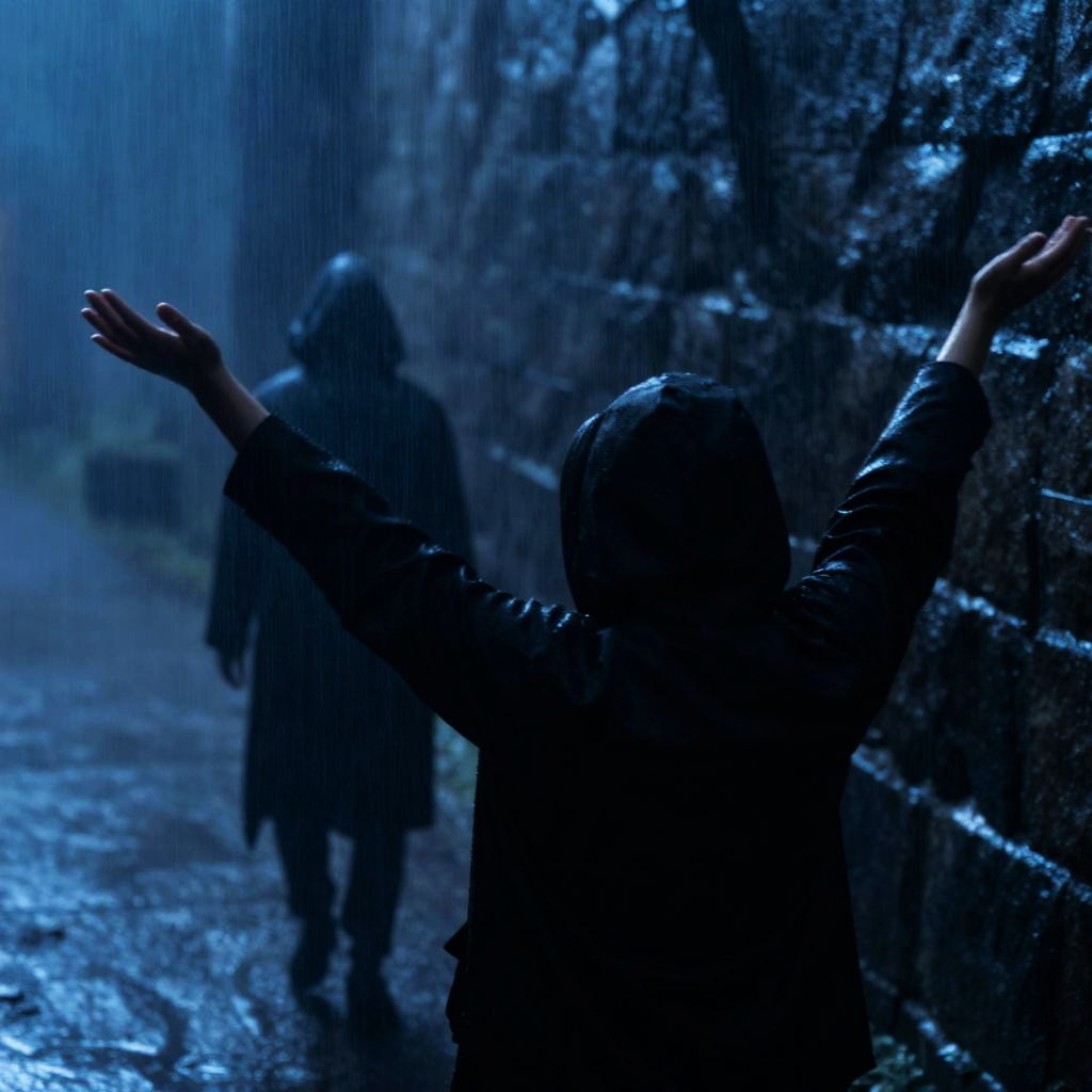 Photograph of a dimly lit, blue-hued scene with heavy rain. Silhouetted figure in foreground, arms raised, facing a shadowy figure in a hooded garment in the background. Rain creates a misty atmosphere, stone wall on the right.