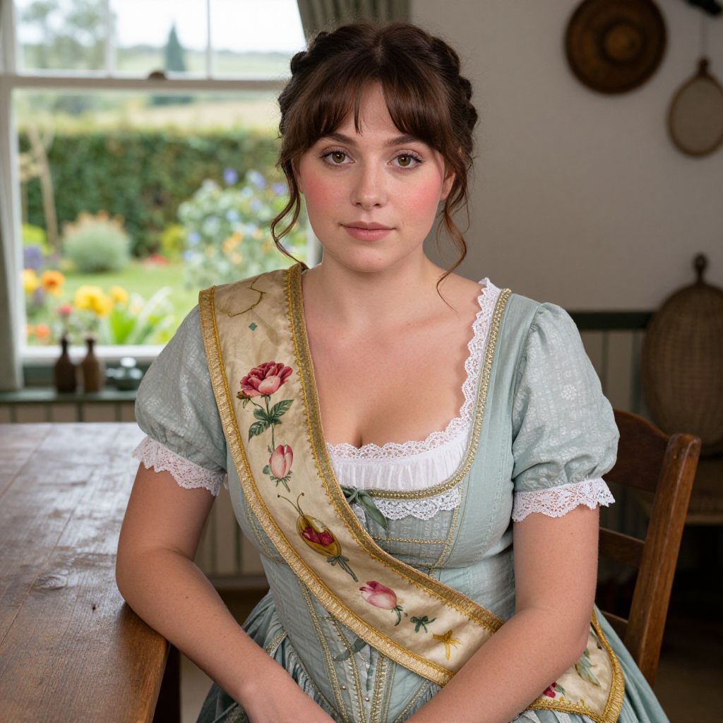 A detailed and realistic portrait of a woman in modern day tea party attire — featuring a layered look with a corseted tea dress, lace trim, and a hand-painted tea-themed sash — sitting at a rustic wooden table in a countryside cottage with a view of a garden, her face calm and expressive with soft, light brown eyes and a gentle pink undertone to her skin.. The woman has big tits and cute face