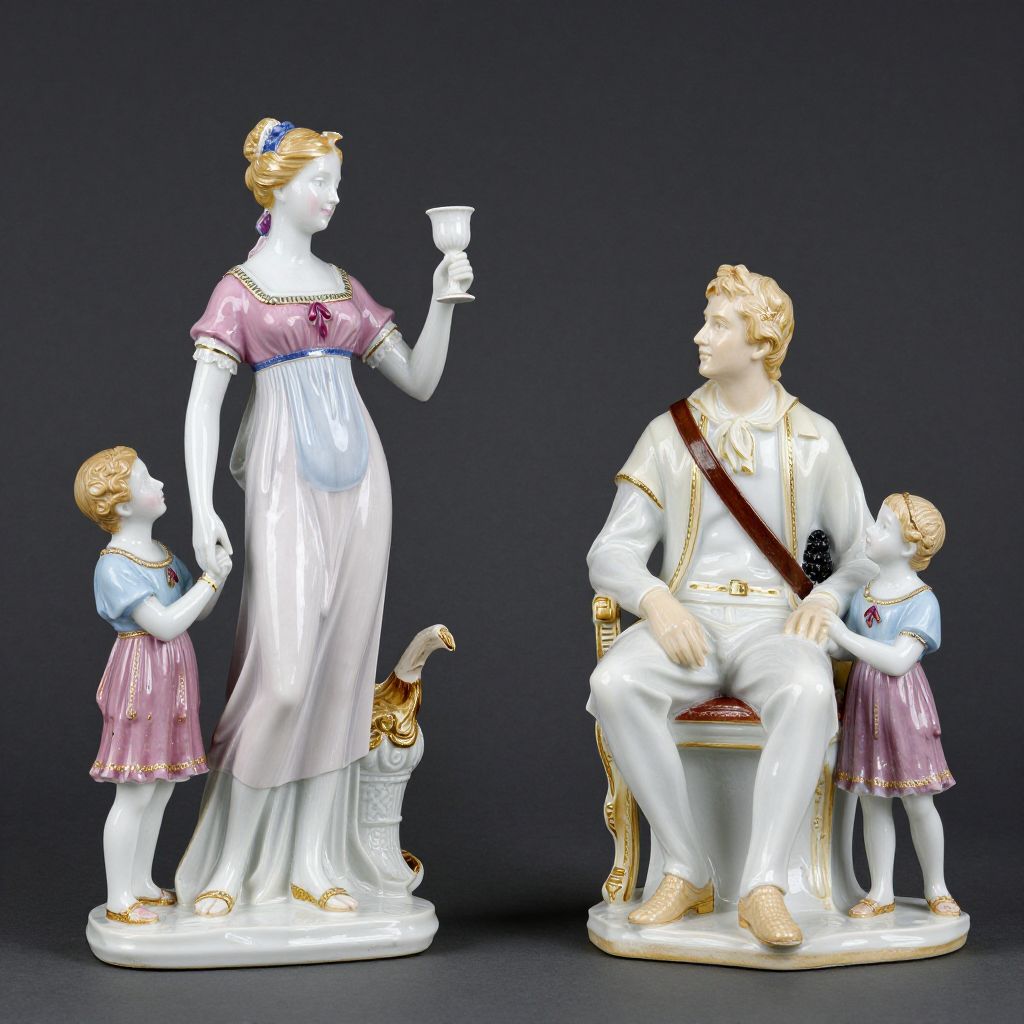 Two intricately detailed Meissen porcelain figurines depict classical scenes of vintners, each featuring a woman holding a goblet, accompanied by a seated man with two small children, all adorned in pastel attire and delicate accessories, set against a dark background.