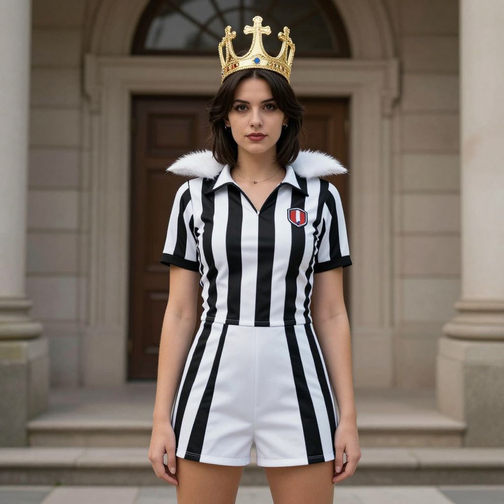 Queen Detention Costume, woman wearing a referee uniform and a crown standing in front of a building