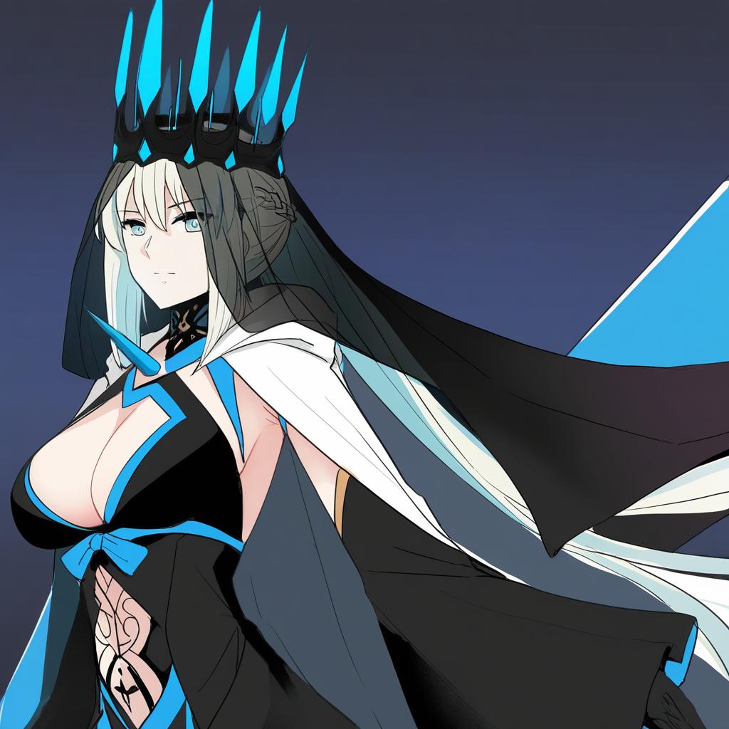 Morgan le fay (queen of winter) (fate), fate/grand order, 1girl, blue lips, blue eyes, very long hair, grey hair, white hair, ponytail, sidelocks, french braid, braid, large breasts, black dress, two-tone dress, veil, black gloves, long sleeves, wide sleeves, crown, by artist h2o (ddks2923), leet