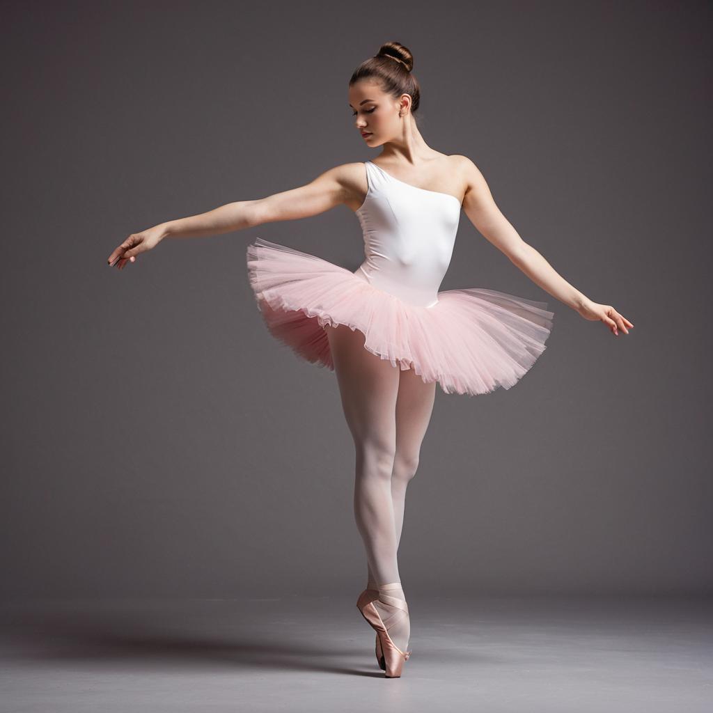 High end dance costume, photograph of a beautiful ballet dancer, light skin, brown hair in a neat bun, wearing a gold and cream satin corset and tutu, arms raised gracefully, elegant pose, soft lighting, gray background, realistic style, detailed ures on corset and tutu, soft and delicate fabrics, professional ballet attire, poised and confident expression, subtle makeup, focused and calm gaze, studio shot, no visible