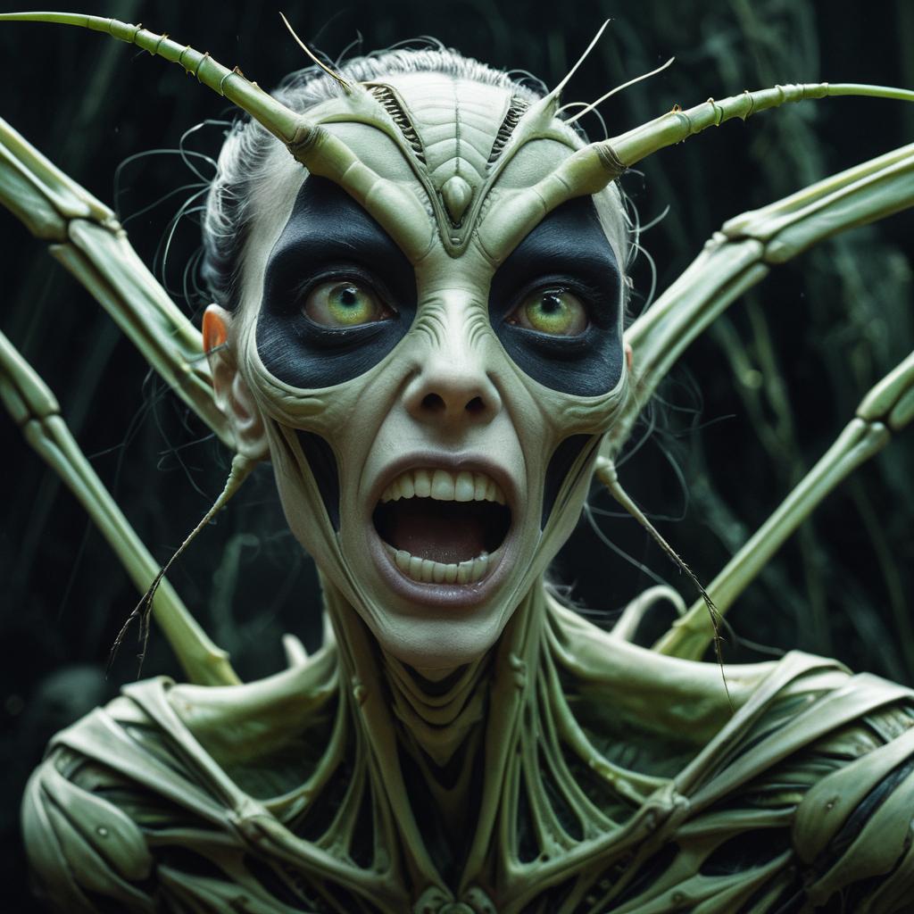 Ultra-realistic close-up portrait of a pale, husk-like woman with dehydrated skin and mantis-like eyes. The character has an agonized expression and intricate anatomical details, blending fantasy and sci-fi elements. The image showcases sharp features, greenish hues, and exaggerated insectoid antennae, inspired by digital artists known for detailed character designs.