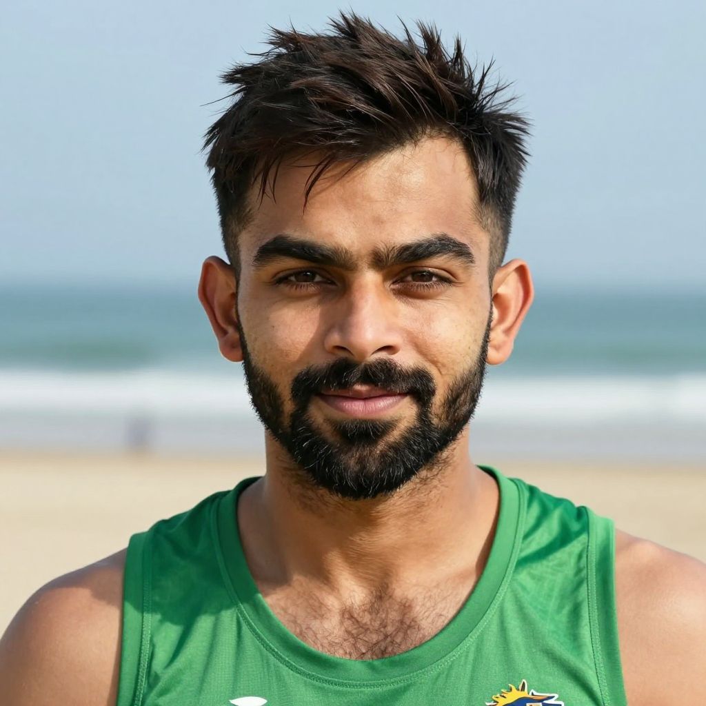 Photo virat kohli, beach background, wearing (green) tanktop, 8k, detailed face, ultra-realistic