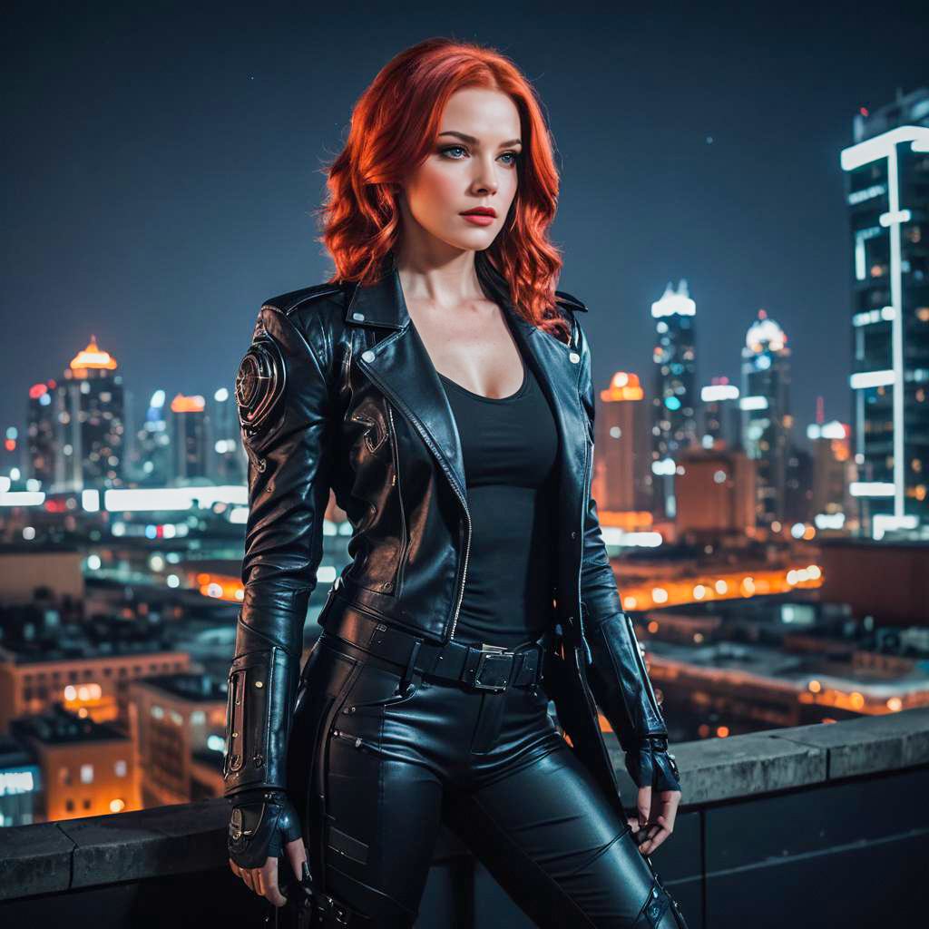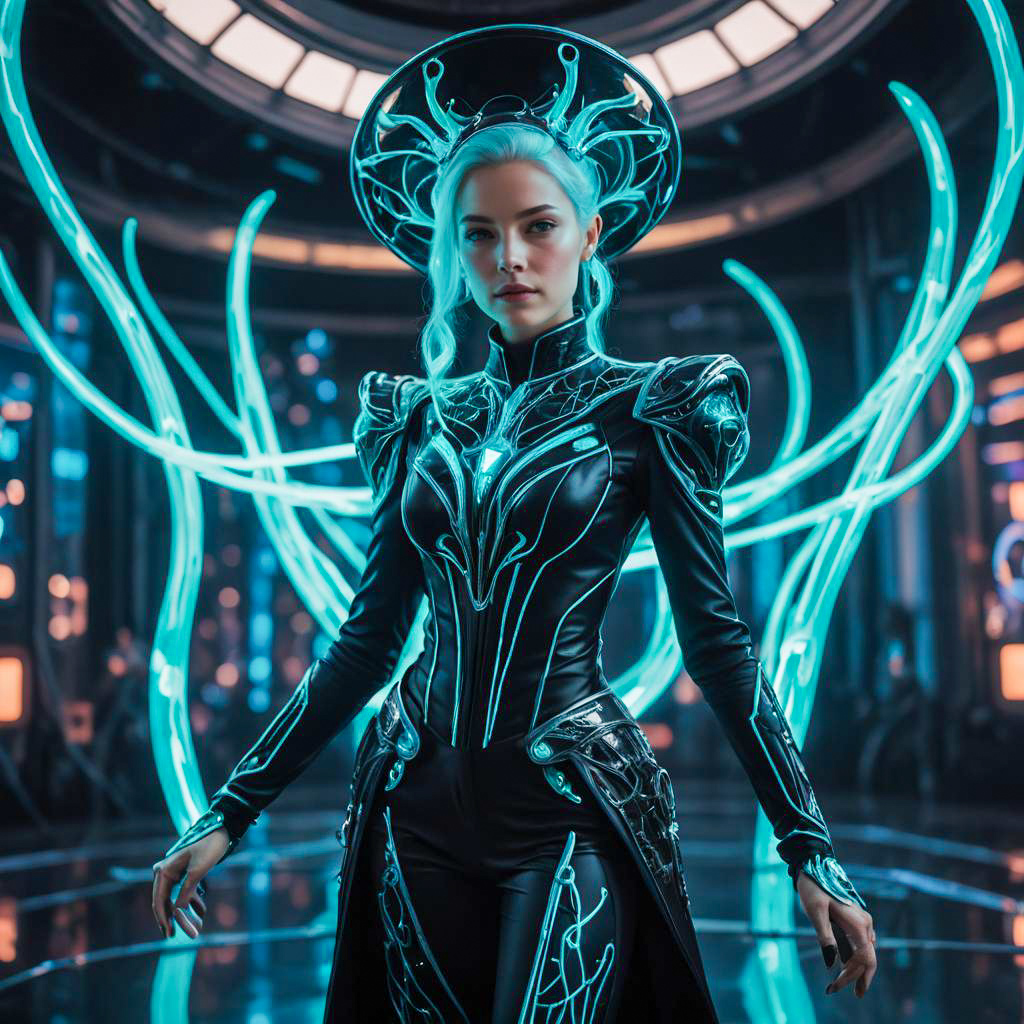 Portrait of a slender female alien diplomat wearing a glowing bioluminescent space cowgirl outfit with intricate futuristic armor and glowing blue-green tendrils. The background features a studio setting with neon circular light patterns, creating a sci-fi alien planet atmosphere.