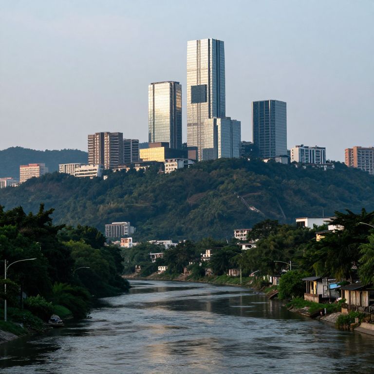 Photograph of a city skyline with tall glass skyscrapers on a hilltop overlooking a river, surrounded by trees and buildings.