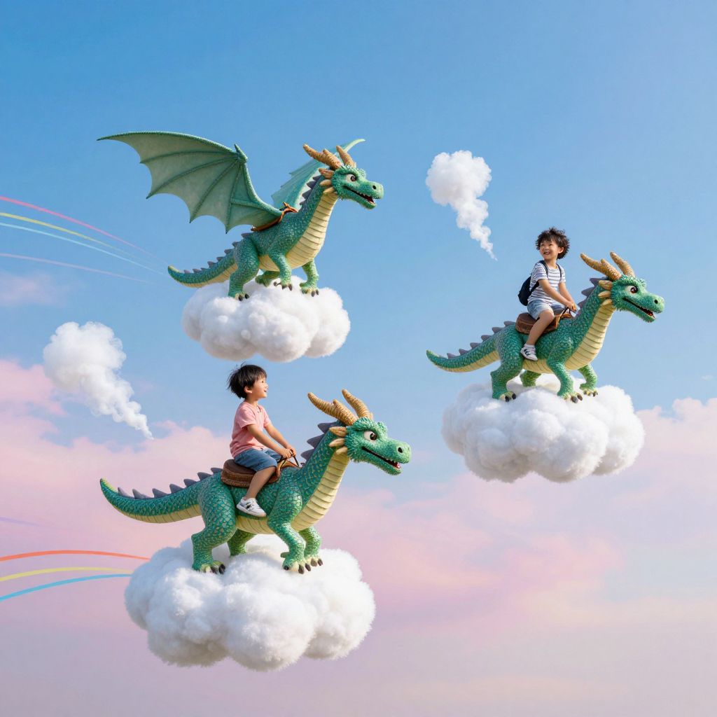 Two children joyfully ride mythical dragons through a vibrant sky, each dragon perched atop fluffy white clouds while trailing playful puffs of smoke and colorful streaks, creating a whimsical scene of imaginative adventure.