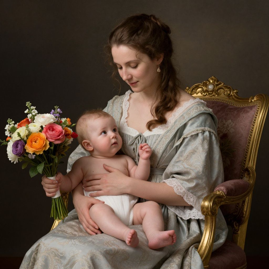 Woman seated gracefully in a regal setting, cradling a delicate infant on her lap while presenting a vibrant bouquet of flowers, exuding elegance and maternal tenderness in a classical portrait reminiscent of 19th-century European artistry.